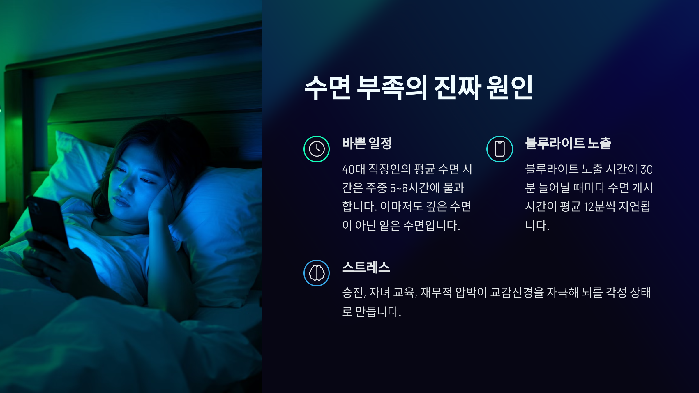 40대에 접어들면 체력도, 집중력도 예전 같지 않다는 걸 실감합니다. 퇴근 후 밀린 집안일, 자녀 학습 챙기기, 겨우 잠자리에 들었는데도 아침이 되면 피로가 풀리지 않습니다. 혹시 당신도 ‘자는 데도 피곤한’ 수면 문제로 고민 중이신가요?