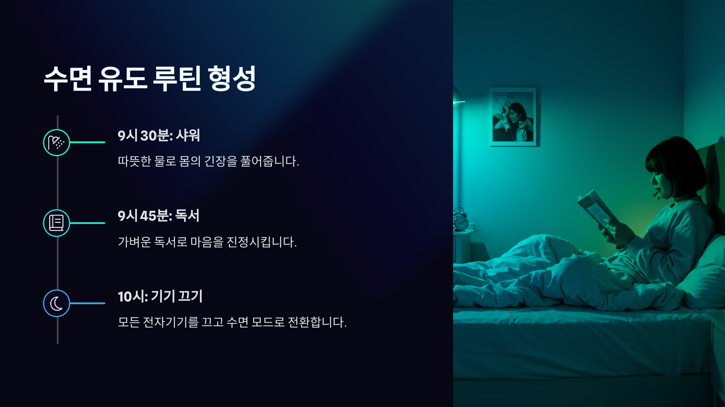 수면 루틴은 뇌에 ‘이제 잘 시간이야’를 알려주는 중요한 신호입니다. 매일 같은 시간에 씻고, 명상이나 독서를 일정 시간 하고, 조명을 어둡게 만드는 것만으로도 뇌는 휴식 준비를 시작합니다. 특히 ‘취침 준비 타이머’를 스마트폰에 설정하면 행동 유도에 큰 도움이 됩니다.