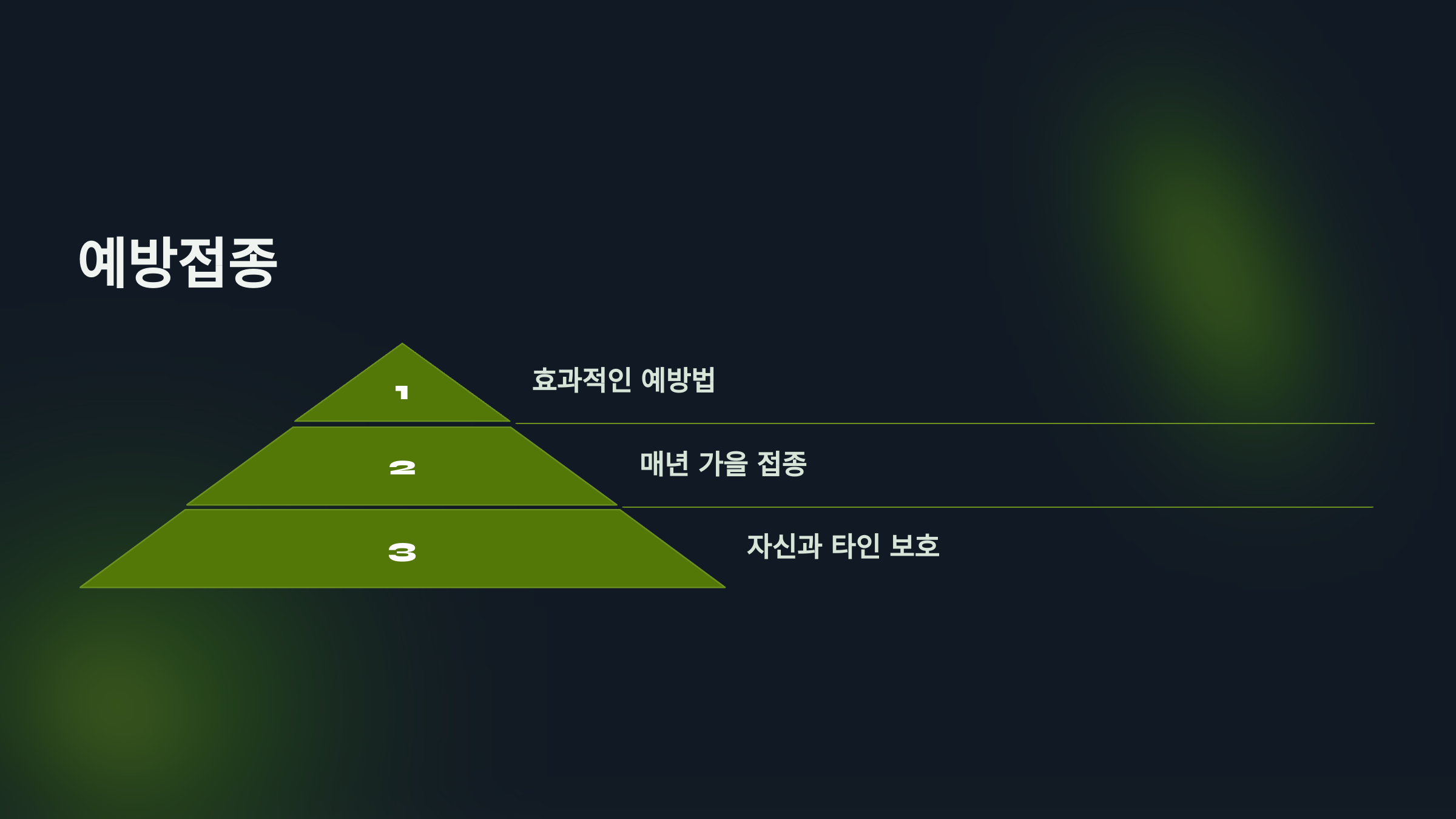 독감 예방접종은 독감 예방의 가장 효과적인 방법 중 하나입니다. 매년 가을에 접종을 받는 것이 좋습니다. 예방접종은 마치 방패를 만드는 것과 같습니다. 방패가 있으면 적의 공격을 막을 수 있듯이, 예방접종을 통해 독감 바이러스로부터 자신을 보호할 수 있습니다. 예방접종은 단순한 예방책이 아니라, 우리 자신과 주변 사람들을 지키는 중요한 방법입니다. 독감이 유행하는 시기에 예방접종을 통해 면역력을 높이면, 건강한 겨울을 보낼 수 있습니다.