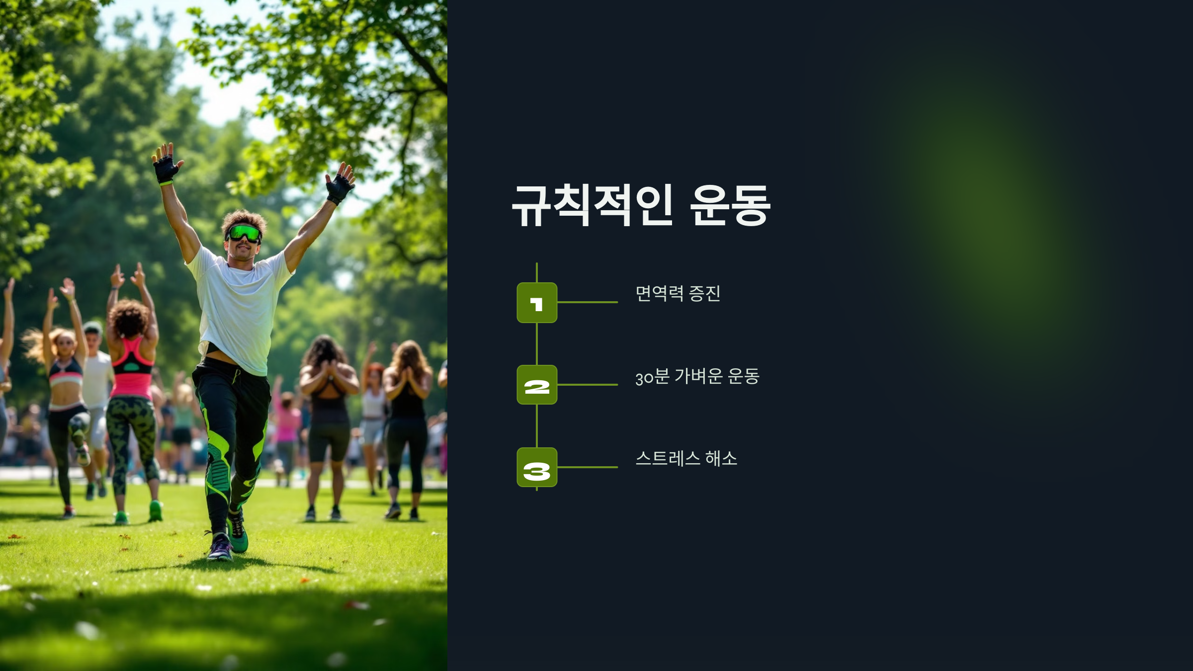 운동은 면역력을 높이는 데 큰 도움이 됩니다. 규칙적인 운동은 혈액 순환을 촉진하고, 스트레스를 줄여줍니다. 매일 30분 정도의 가벼운 운동을 통해 몸을 움직이면, 독감 예방에 큰 효과를 볼 수 있습니다. 운동은 마치 몸의 엔진을 가동하는 것과 같습니다. 엔진이 원활하게 돌아가야 차가 잘 달리듯, 우리의 몸도 활발하게 움직여야 건강을 유지할 수 있습니다. 운동을 통해 우리는 몸의 활력을 느끼고, 정신적인 스트레스도 해소할 수 있습니다. 운동은 단순한 신체 활동이 아니라, 삶의 질을 높이는 중요한 요소입니다.