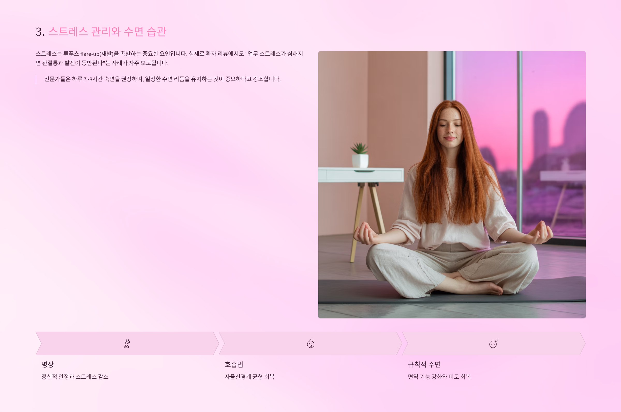 명상, 호흡법, 규칙적인 수면 습관은 스트레스와 피로를 줄이는 핵심 전략입니다.