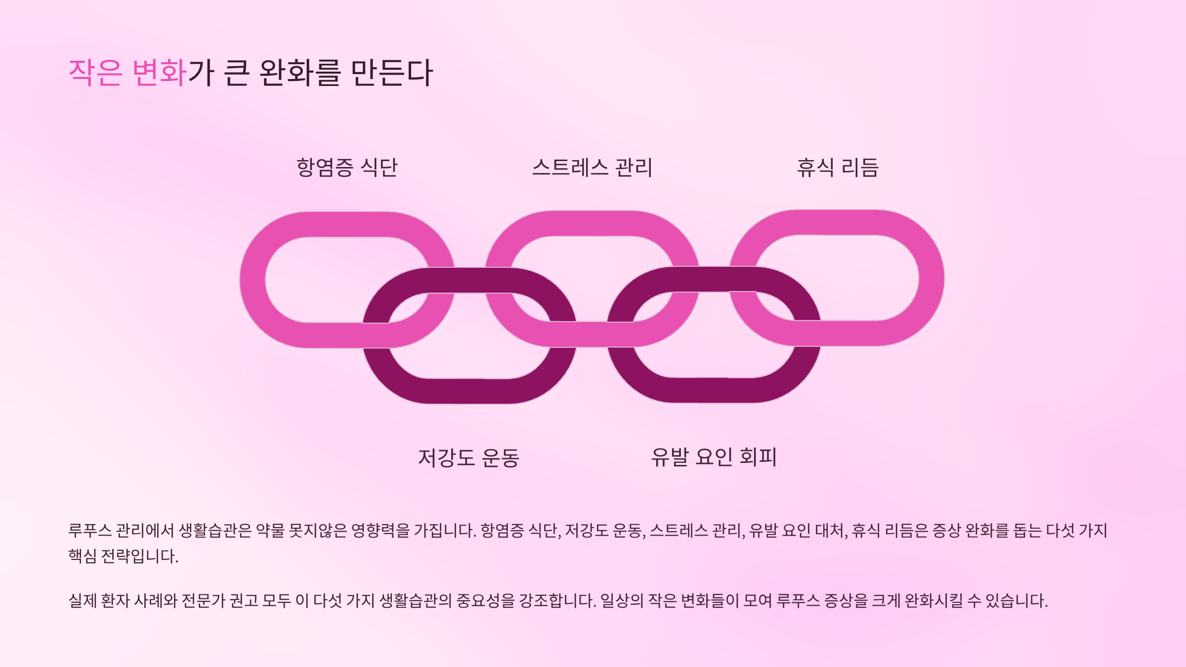 항염증 식단, 저강도 운동, 스트레스 관리, 유발 요인 대처, 휴식 리듬은 증상 완화를 돕는 다섯 가지 핵심 전략입니다.