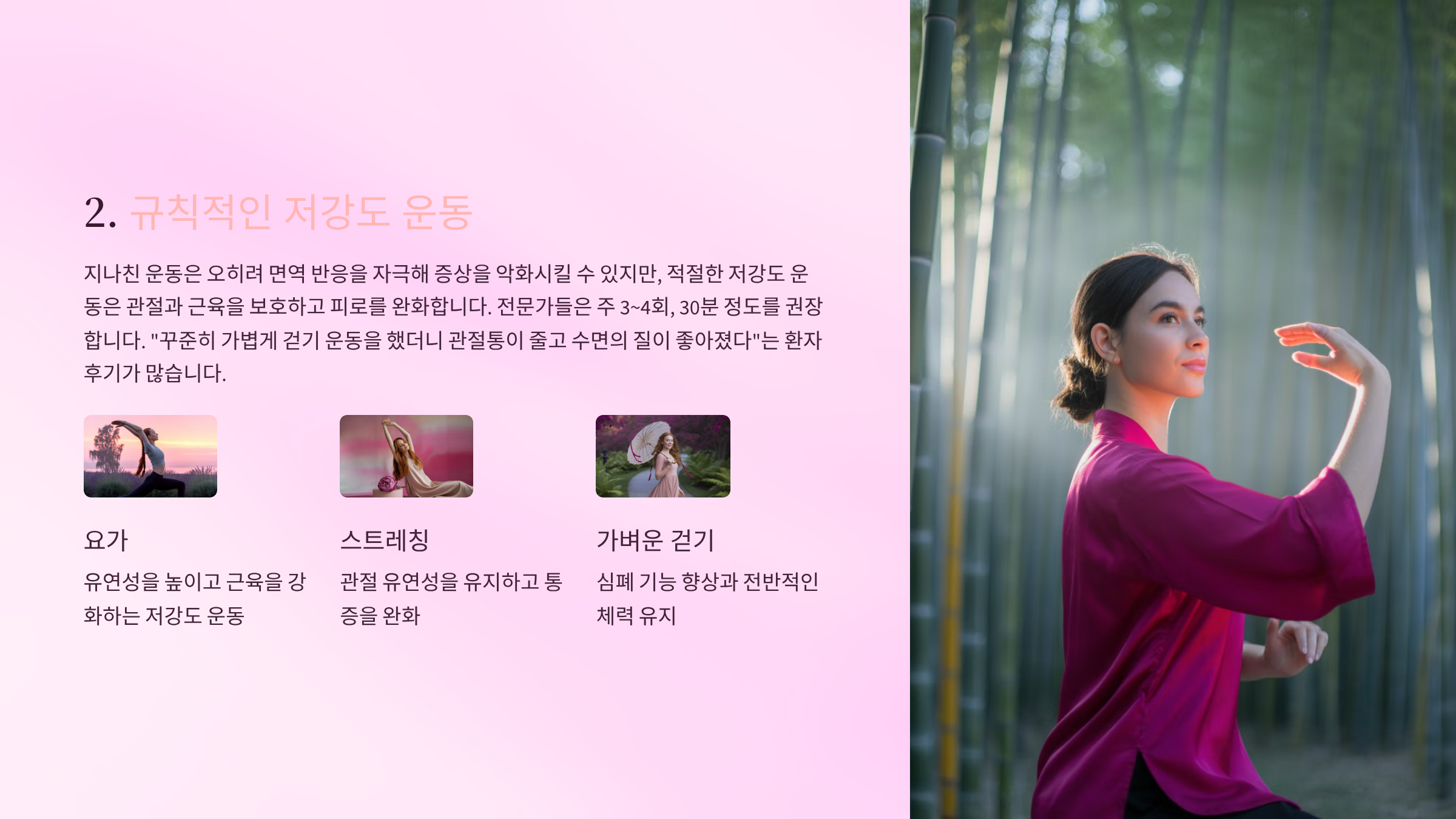 지나친 운동은 오히려 면역 반응을 자극해 증상을 악화시킬 수 있지만, 적절한 저강도 운동은 관절과 근육을 보호하고 피로를 완화합니다.
