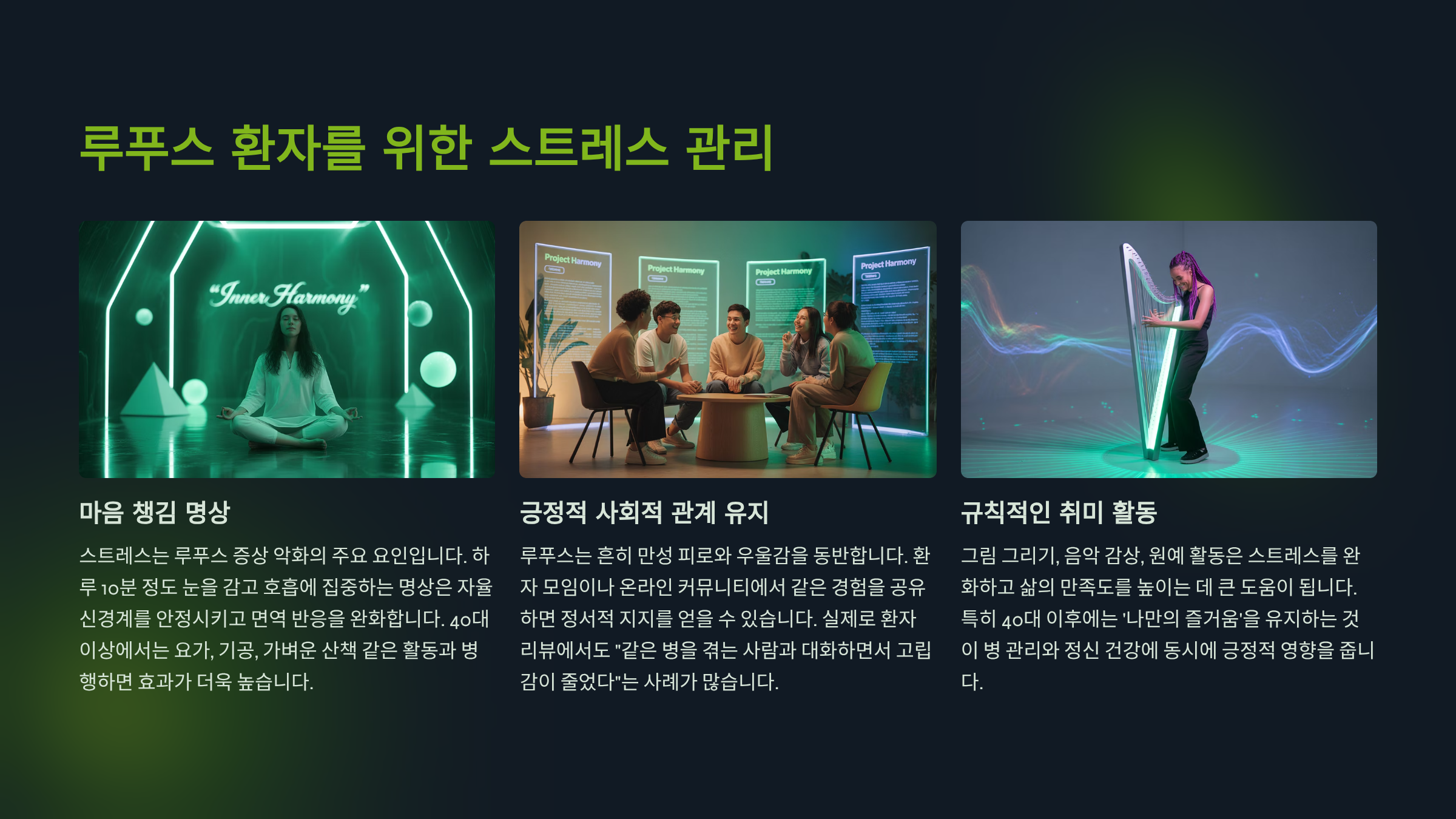루푸스는 완치가 어려운 만성질환이지만, 생활 관리 습관만 잘 잡아도 증상을 크게 줄일 수 있습니다.