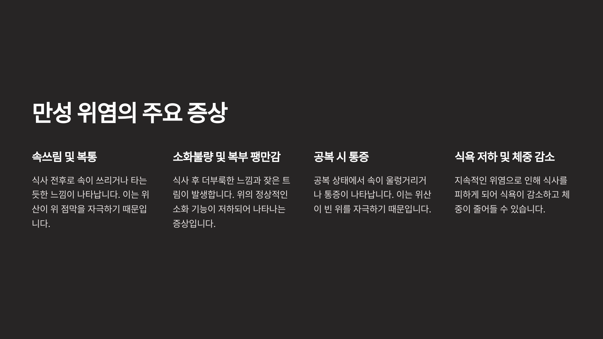 • 공복 시 통증: 공복 상태에서 속이 울렁거리거나 통증이 나타남