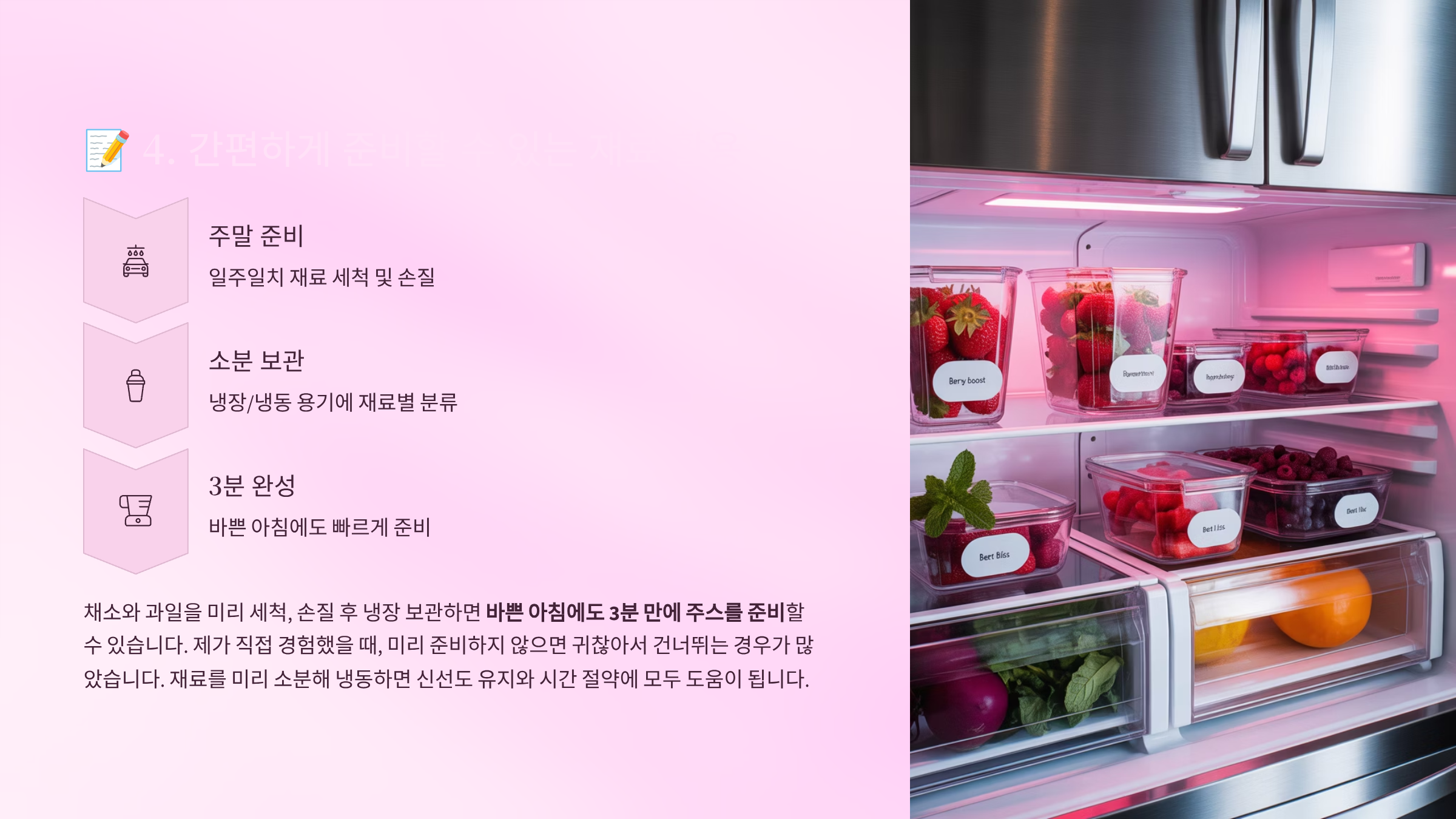채소와 과일을 미리 세척, 손질 후 냉장 보관하면 **바쁜 아침에도 3분 만에 주스를 준비**할 수 있습니다.