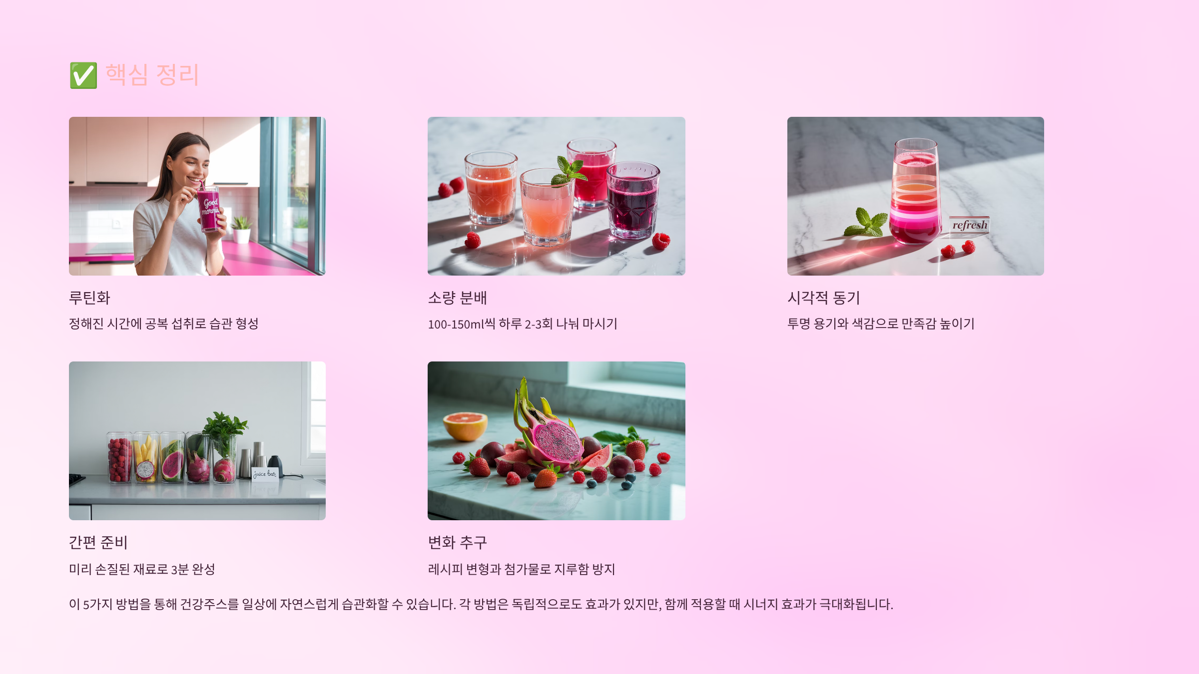 5가지 실천 팁을 활용하면 건강주스를 일상에 자연스럽게 습관화할 수 있습니다.