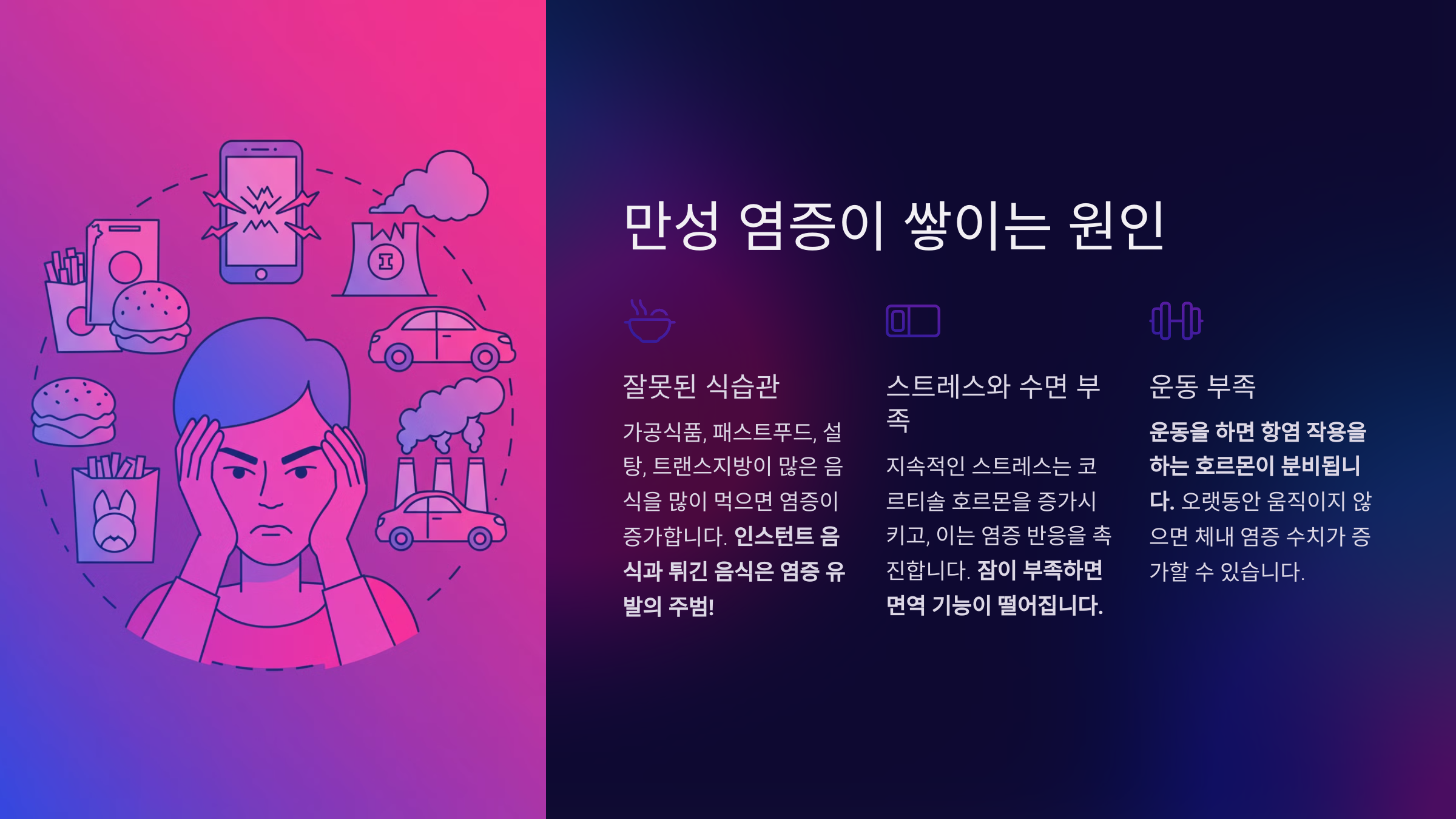 오늘은 만성 염증이 쌓이면 어떤 일이 생기는지, 그리고 이를 해결하기 위한 방법을 알아보겠습니다.