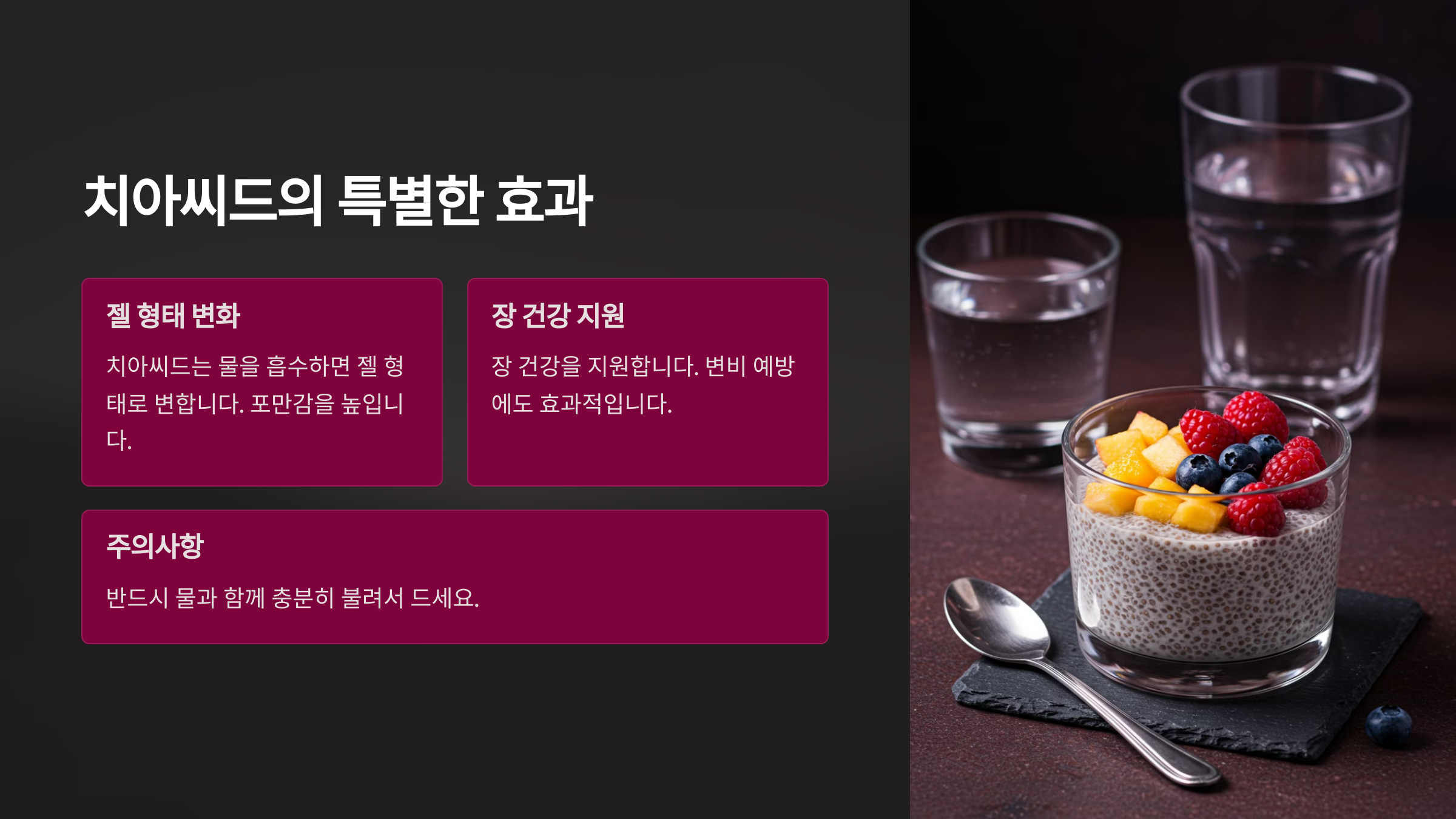 치아시드는 물을 흡수하면 젤 형태로 변하며 포만감을 높이고 장 건강을 지원합니다. 물과 함께 섭취하면 변비 예방에도 효과적입니다.
