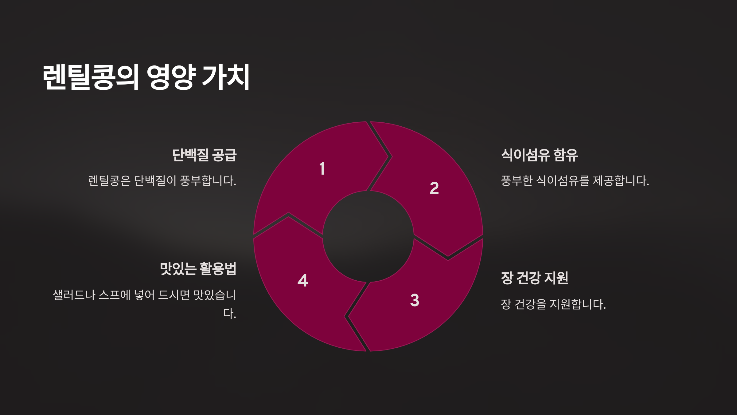 렌틸콩은 단백질과 함께 풍부한 식이섬유를 제공하여 장 건강을 지원합니다. 물과 함께 섭취하면 원활한 소화에 도움이 됩니다.