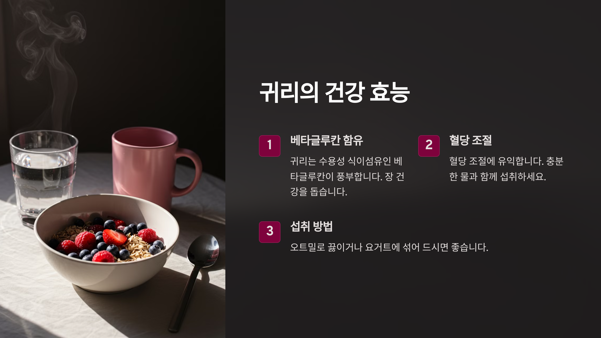 귀리는 수용성 식이섬유인 베타글루칸이 풍부하여 장 건강을 돕고 혈당 조절에 유익합니다. 충분한 물과 함께 섭취하면 소화 흡수가 더욱 원활해집니다.