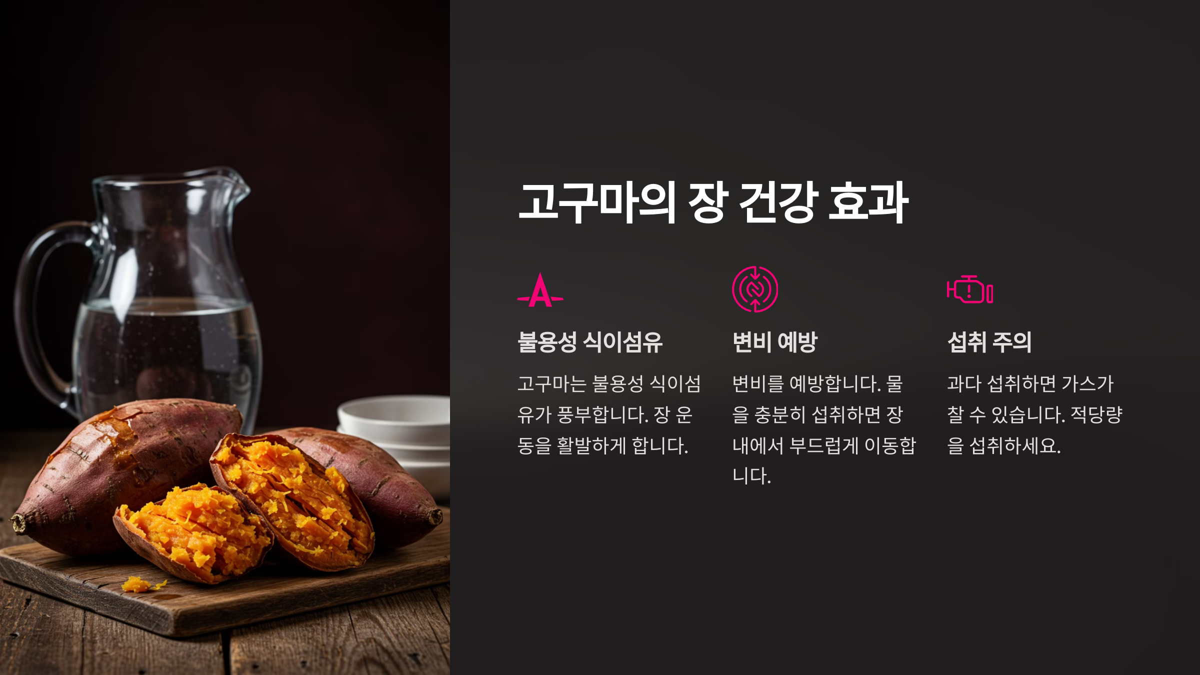 고구마는 불용성 식이섬유가 풍부하여 장 운동을 활발하게 하고 변비를 예방합니다. 물을 충분히 섭취하면 장 내에서 부드럽게 이동할 수 있습니다.