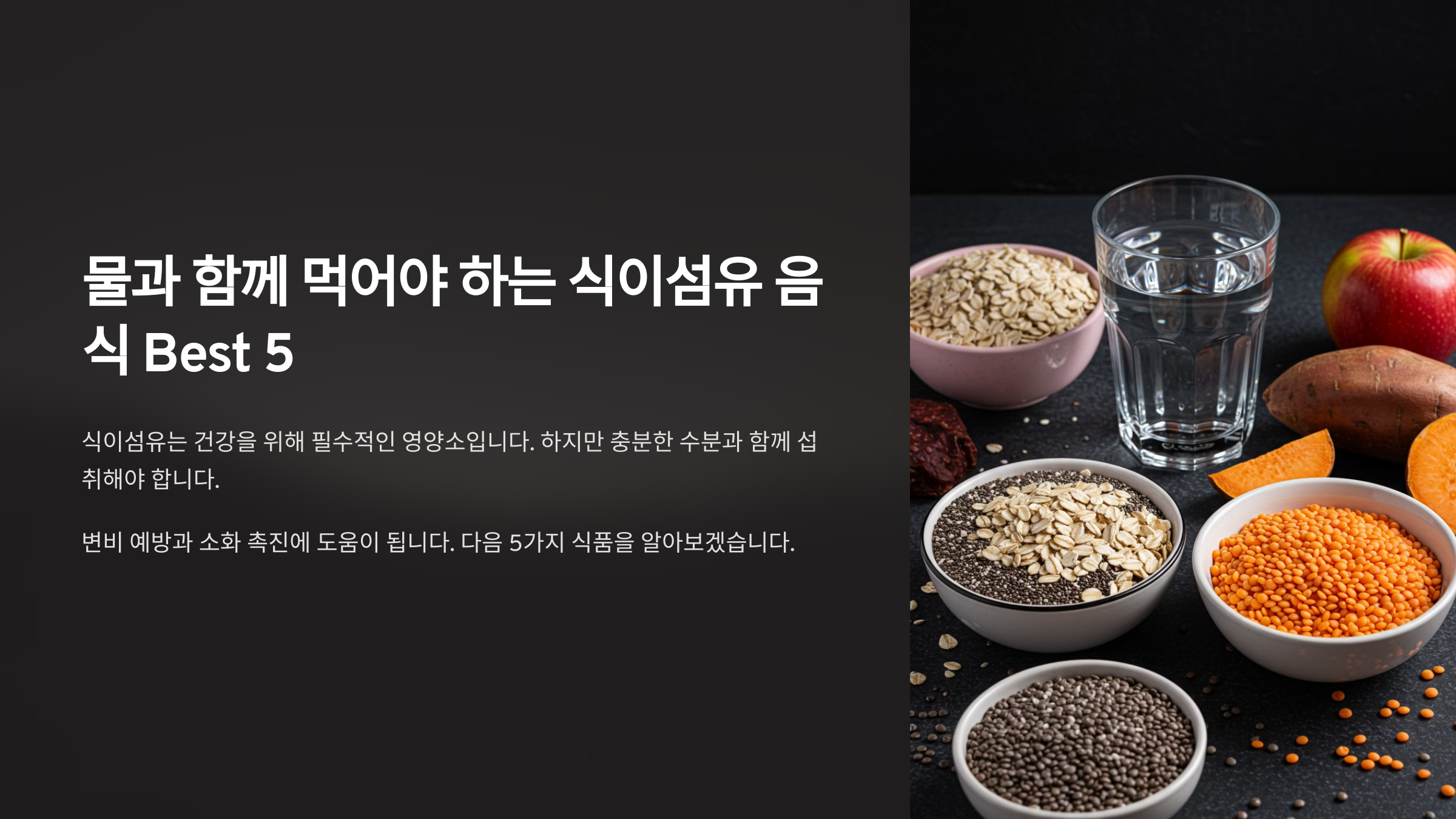 식이섬유는 건강을 위해 필수적인 영양소이지만, 충분한 수분과 함께 섭취해야 변비 예방과 소화 촉진에 도움이 됩니다.