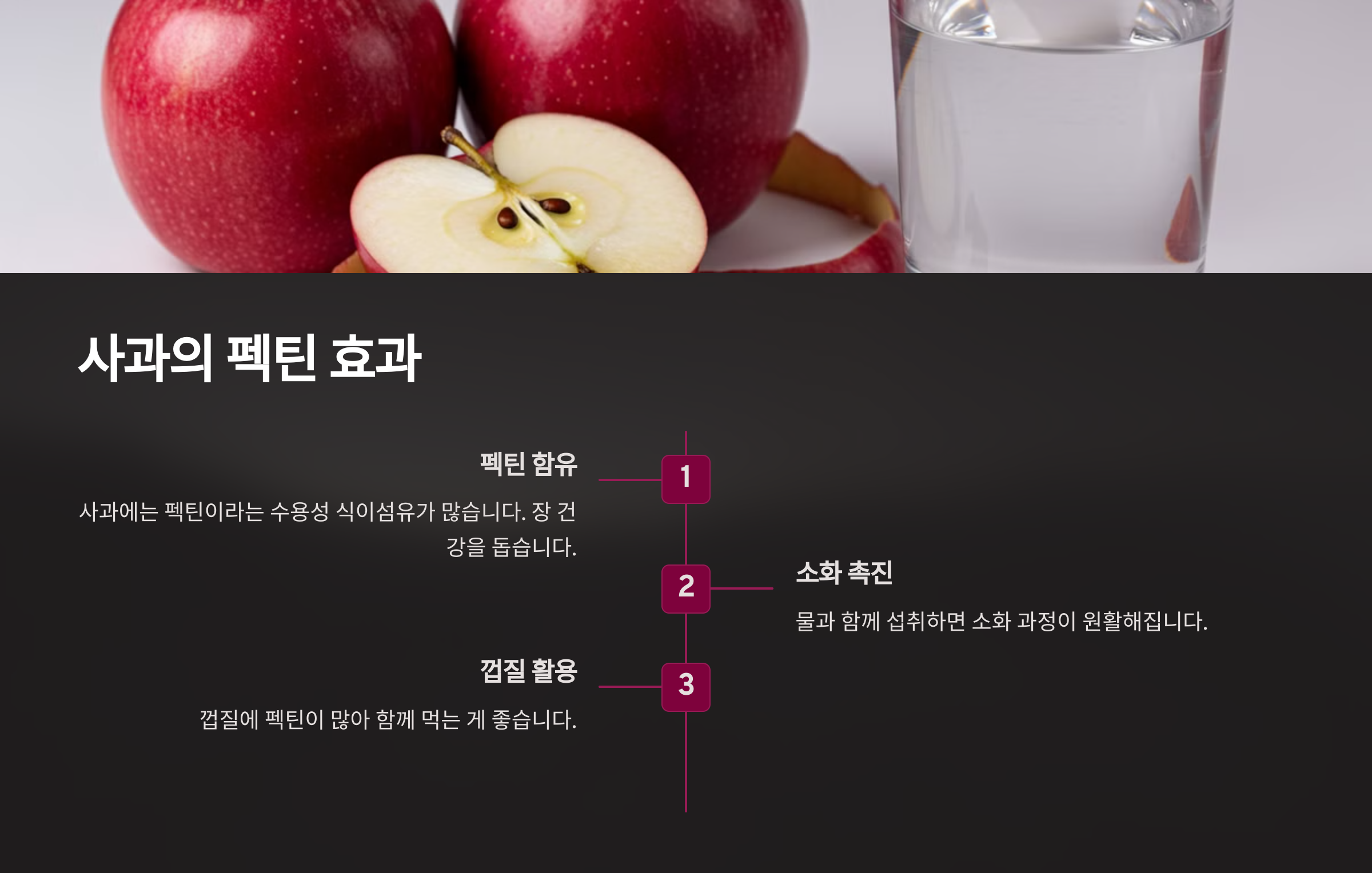 사과에는 펙틴이라는 수용성 식이섬유가 많아 장 건강을 돕고, 물과 함께 섭취하면 소화 과정이 원활해집니다.