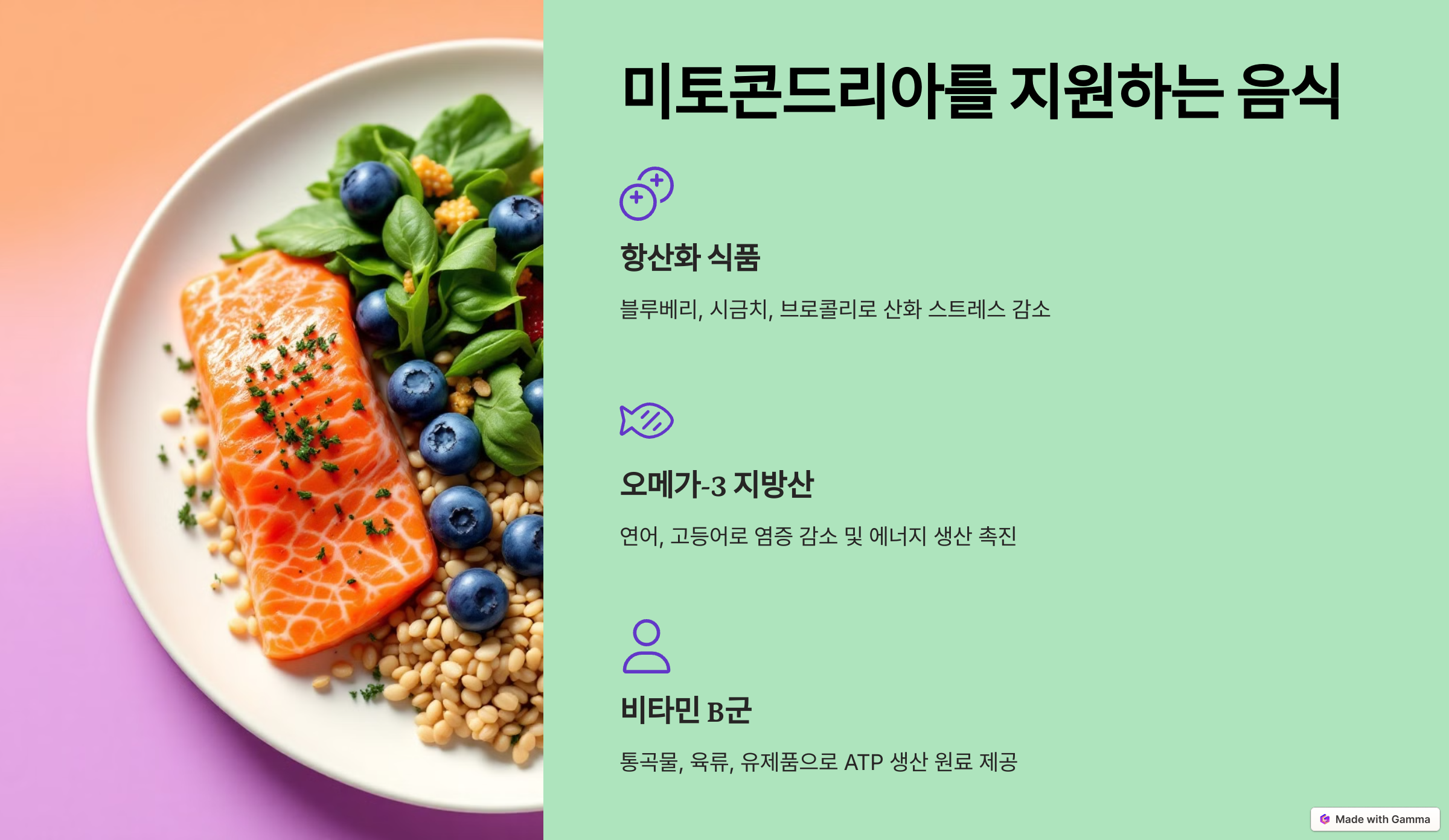 오메가-3 지방산은 미토콘드리아의 기능을 향상하는 데 도움을 줍니다. 연어, 고등어와 같은 기름진 생선은 오메가-3의 훌륭한 공급원입니다. 이 지방산은 염증을 줄이고, 미토콘드리아의 에너지 생산을 촉진합니다. 마치 기름이 엔진을 부드럽게 작동하게 하는 것처럼, 오메가-3는 미토콘드리아의 원활한 기능을 돕습니다.