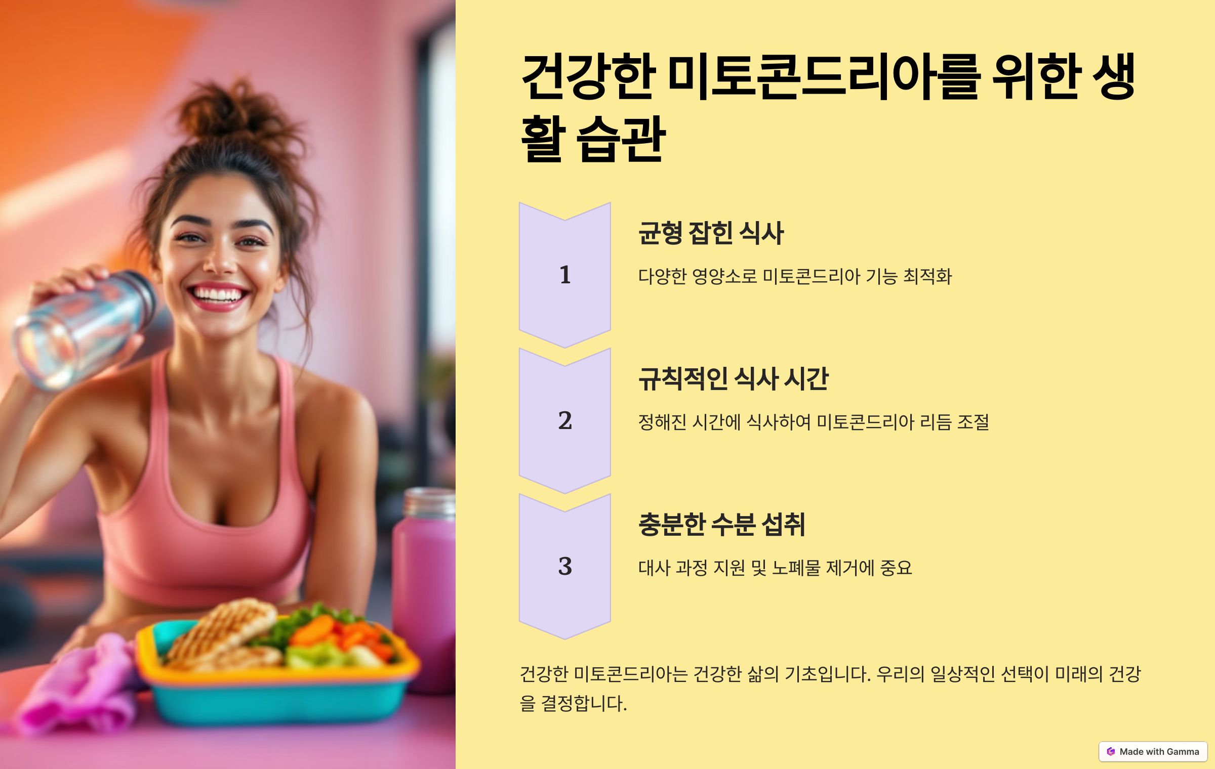 미토콘드리아는 우리의 생명과 건강을 지탱하는 중요한 기관입니다. 이들을 서포트하기 위해서는 올바른 음식 선택이 필수적입니다. 항산화 식품, 오메가-3 지방산, 비타민 B군을 포함한 균형 잡힌 식사는 미토콘드리아의 기능을 최적화하고, 건강한 삶을 유지하는 데 큰 도움이 됩니다. 우리의 몸속 작은 발전소인 미토콘드리아를 소중히 여기고, 건강한 식습관을 통해 그들을 지켜나가는 것이 중요합니다. 건강한 미토콘드리아가 건강한 삶을 만들어 줍니다. 우리의 선택이 우리의 미래를 결정짓는다는 사실을 잊지 말아야 합니다.