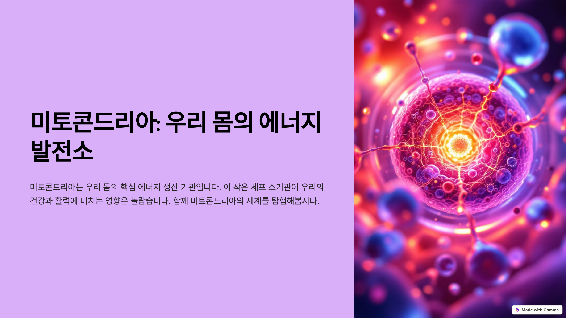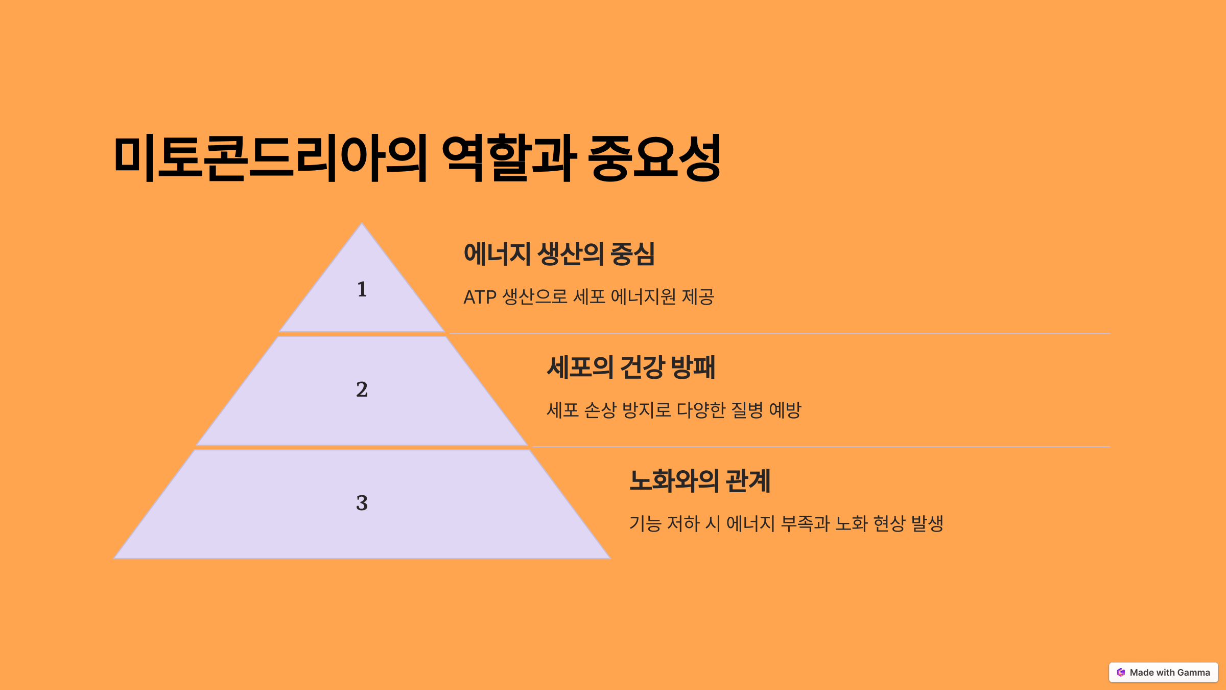 미토콘드리아는 세포의 에너지를 생성하는 ATP(아데노신 삼인산)를 생산합니다. 이 에너지는 우리의 모든 생리적 활동을 가능하게 합니다. 마치 자동차의 엔진이 연료를 태워 움직이는 것처럼, 미토콘드리아는 우리 몸의 모든 활동을 지탱하는 에너지를 만들어냅니다. 이 작은 기관이 없었다면, 우리는 단 하루도 제대로 기능할 수 없었을 것입니다.