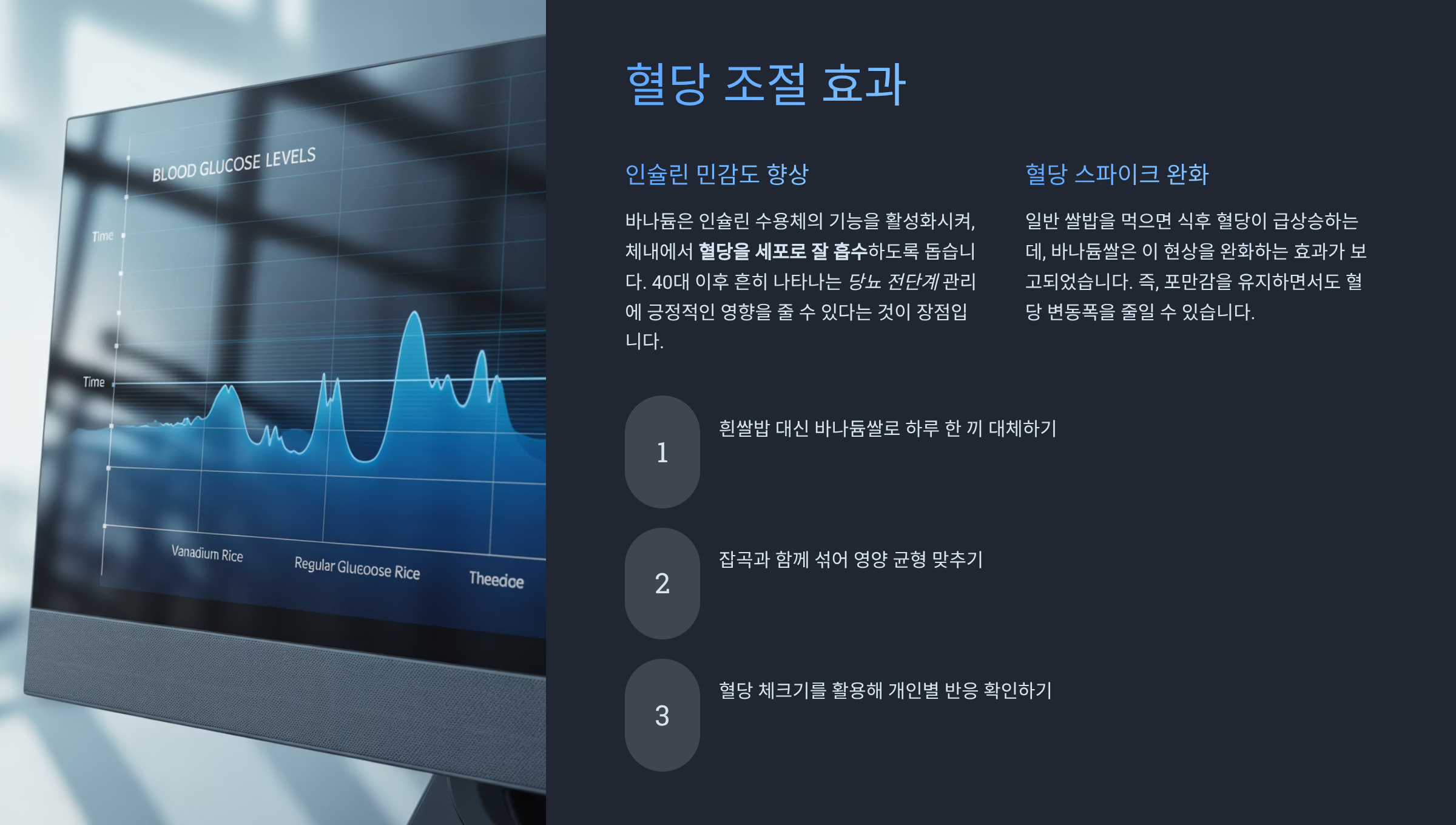 바나듐쌀은 혈당 조절, 콜레스테롤 관리, 노화 억제라는 세 가지 핵심 문제를 동시에 다룰 수 있는 잠재력이 있습니다.