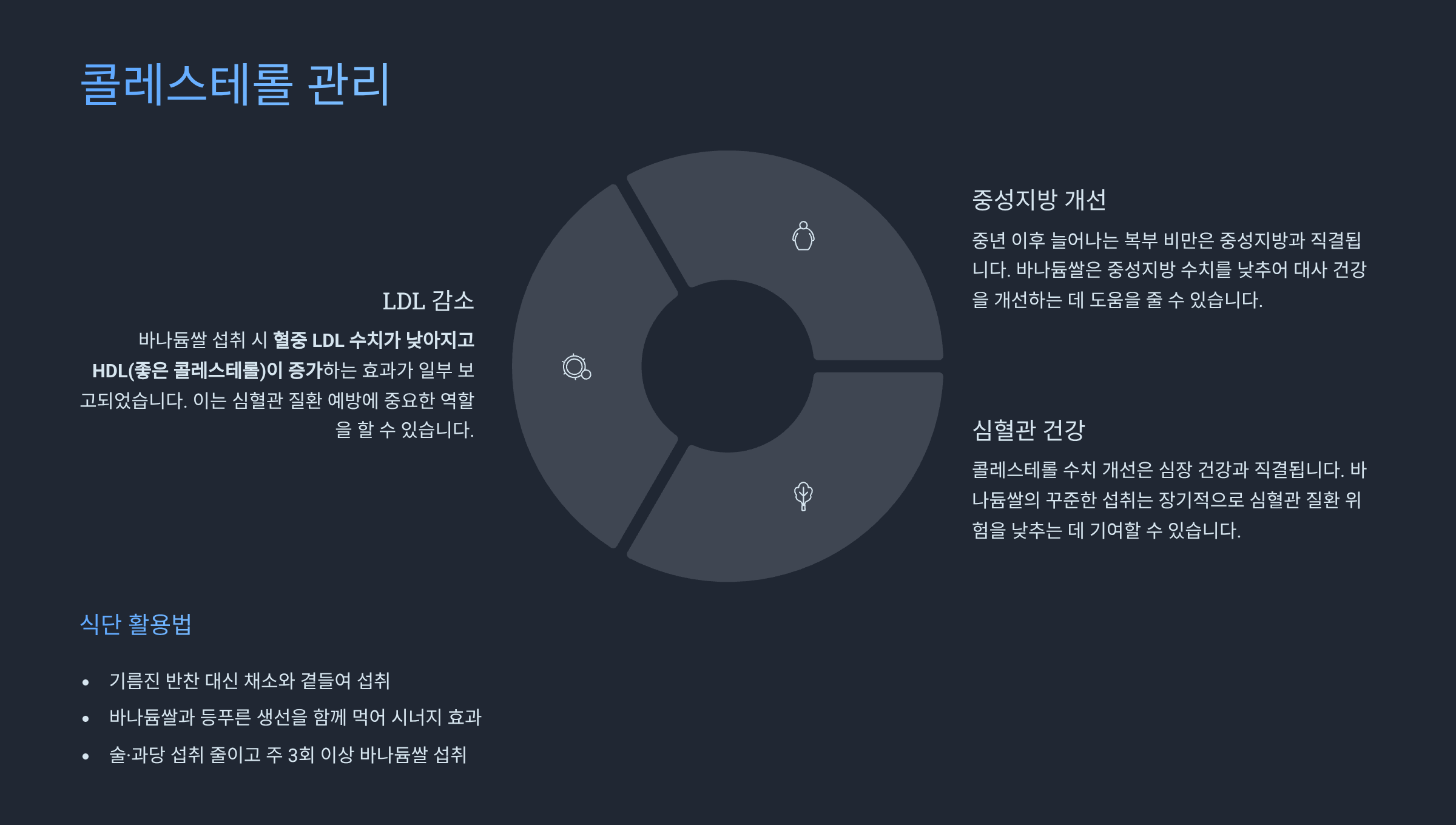 바나듐쌀 섭취 시 혈중 LDL 수치가 낮아지고 HDL(좋은 콜레스테롤)이 증가하는 효과가 일부 보고되었습니다.