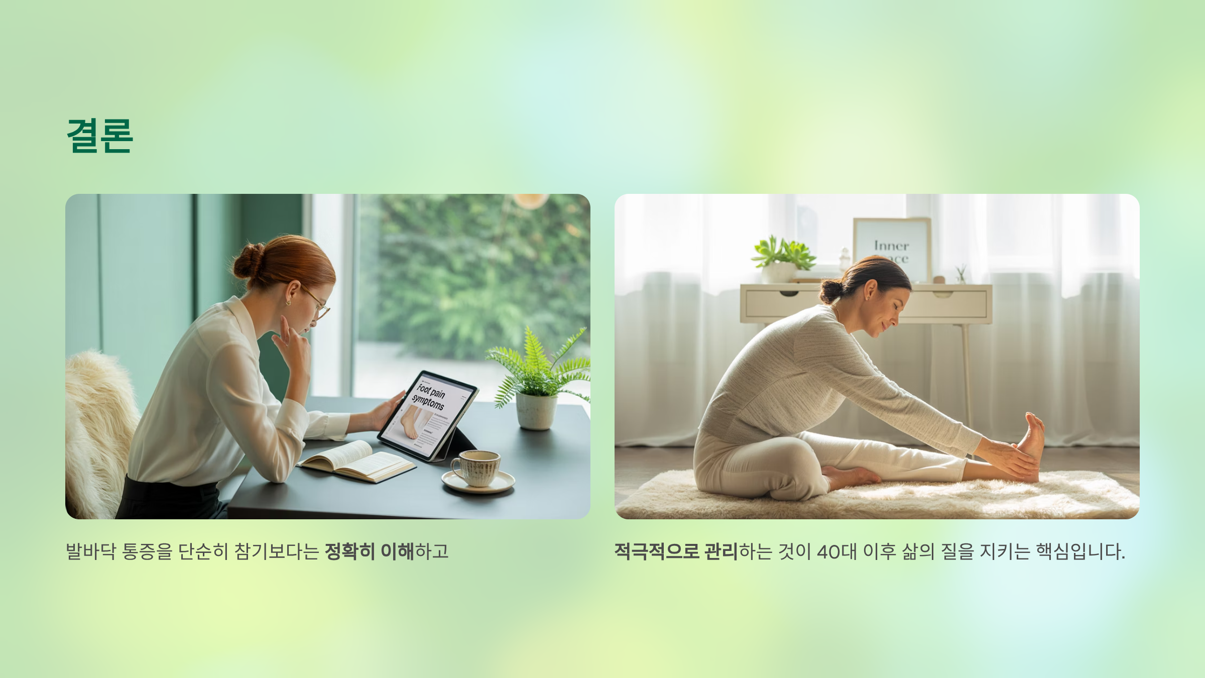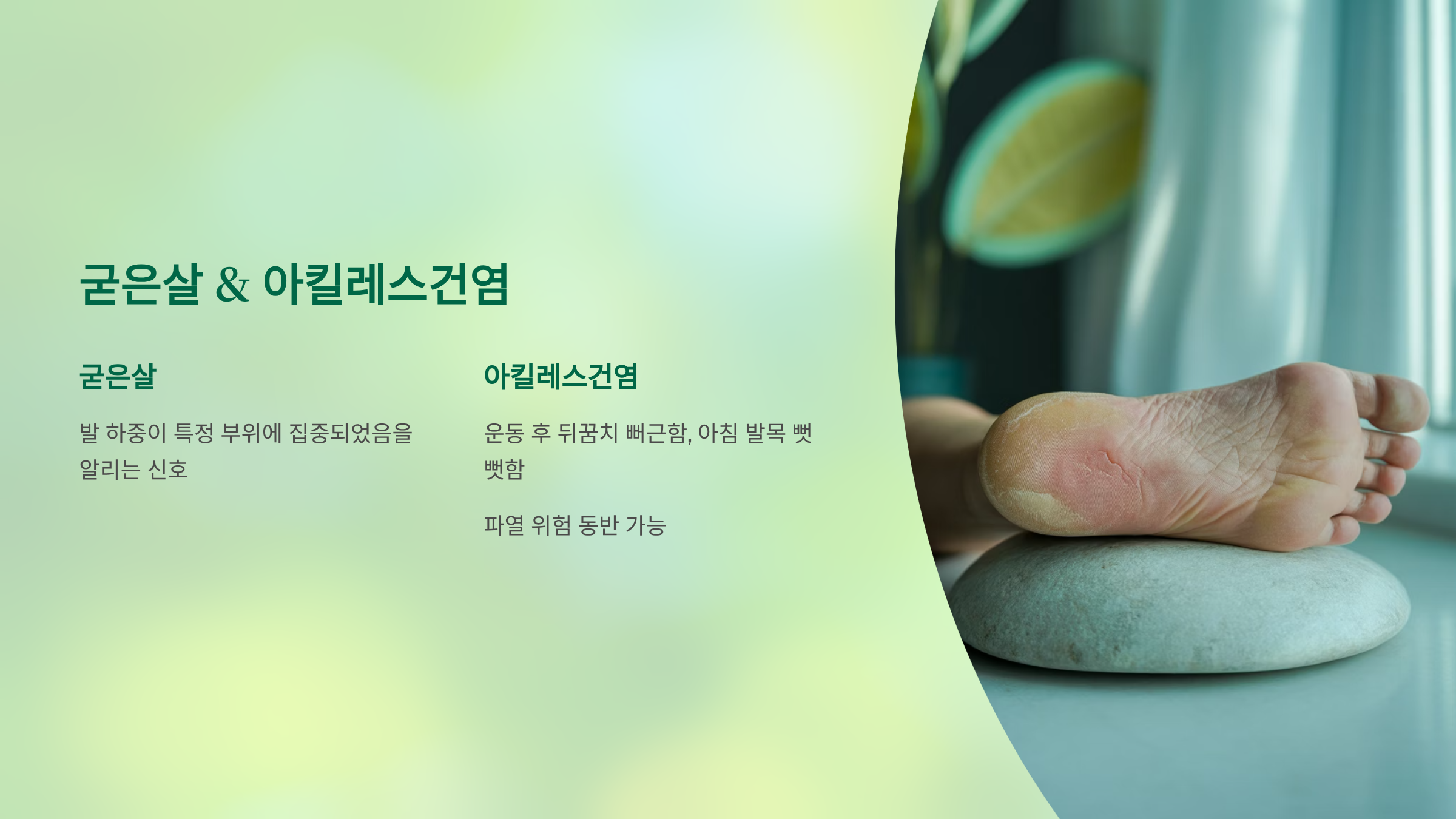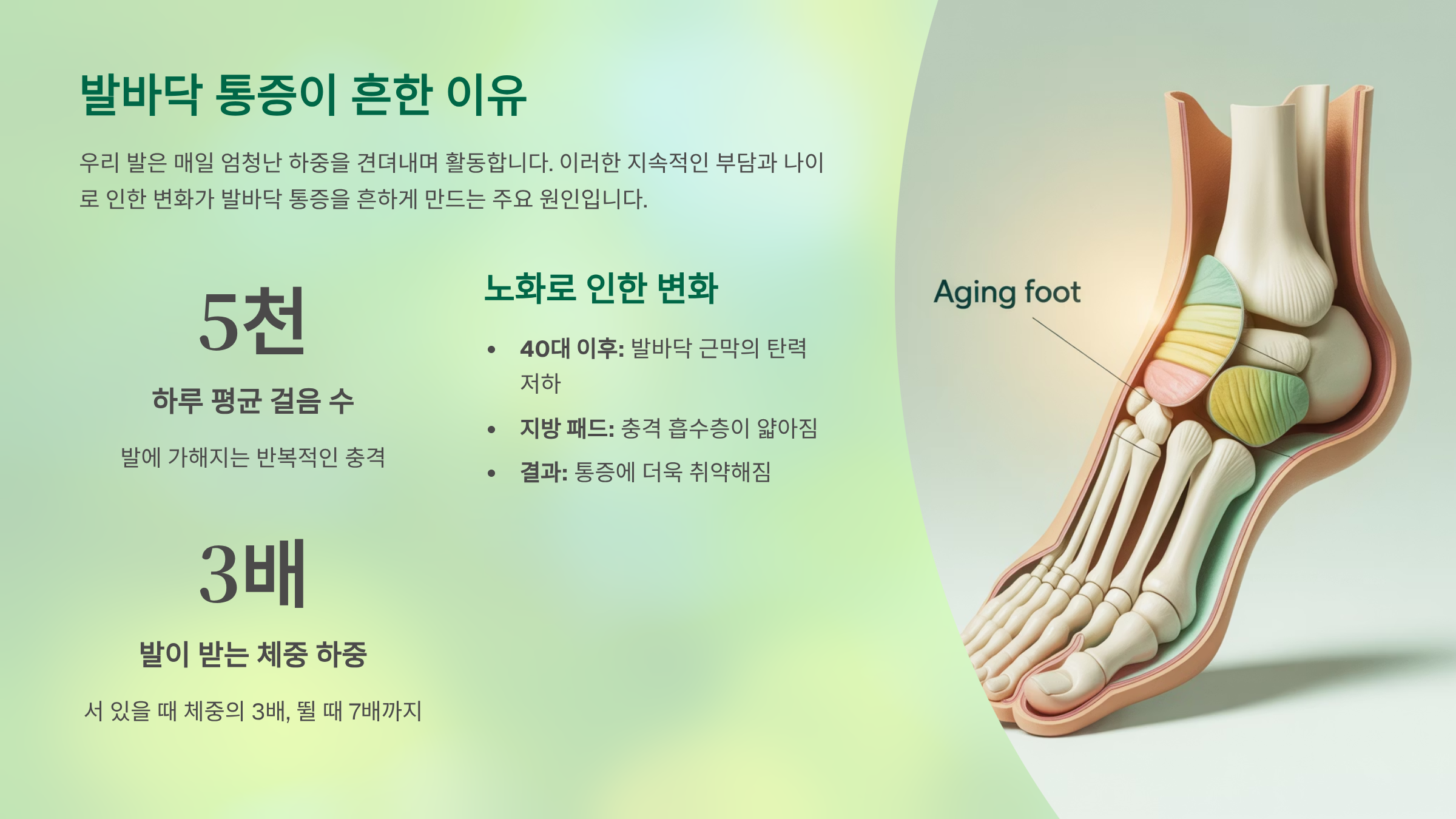 - 발바닥 통증은 단순 피로가 아닌, 구조적·질환적 원인에서 비롯된다.