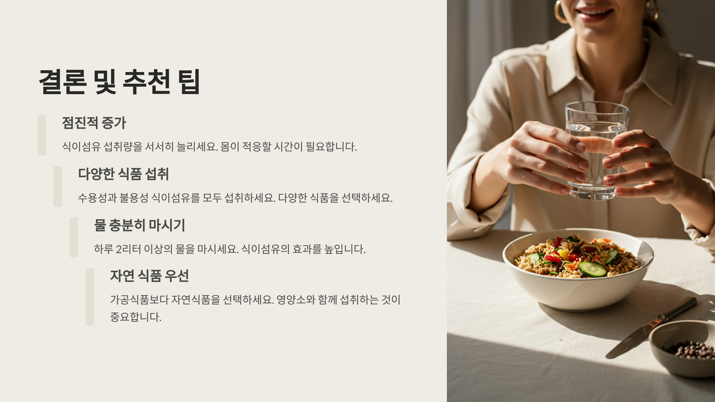 | 급격한 증가 금지 | 갑자기 식이섬유 섭취량을 늘리면 복부 팽만과 가스를 유발할 수 있음 |