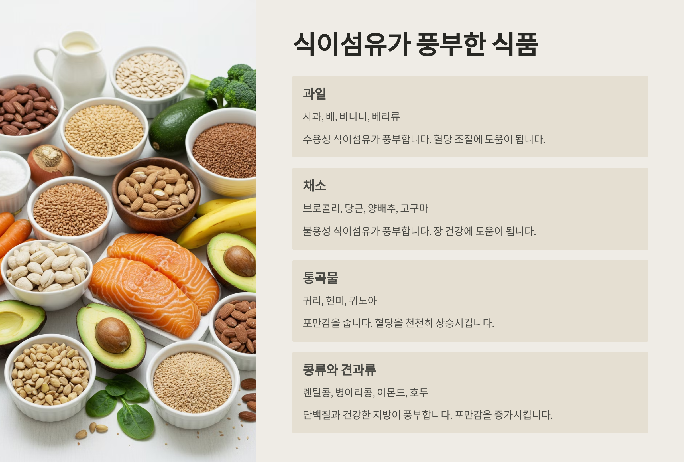 | 과일 | 사과, 배, 바나나, 베리류 | 수용성 식이섬유가 풍부하여 혈당 조절에 도움 |