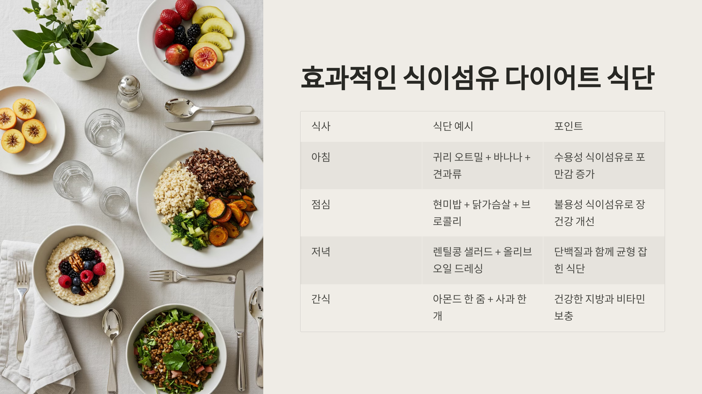 식이섬유를 활용한 다이어트 식단은 영양 균형을 유지하면서도 포만감을 오래 지속시켜 줍니다. 아래와 같이 하루 식단을 구성해 보세요!