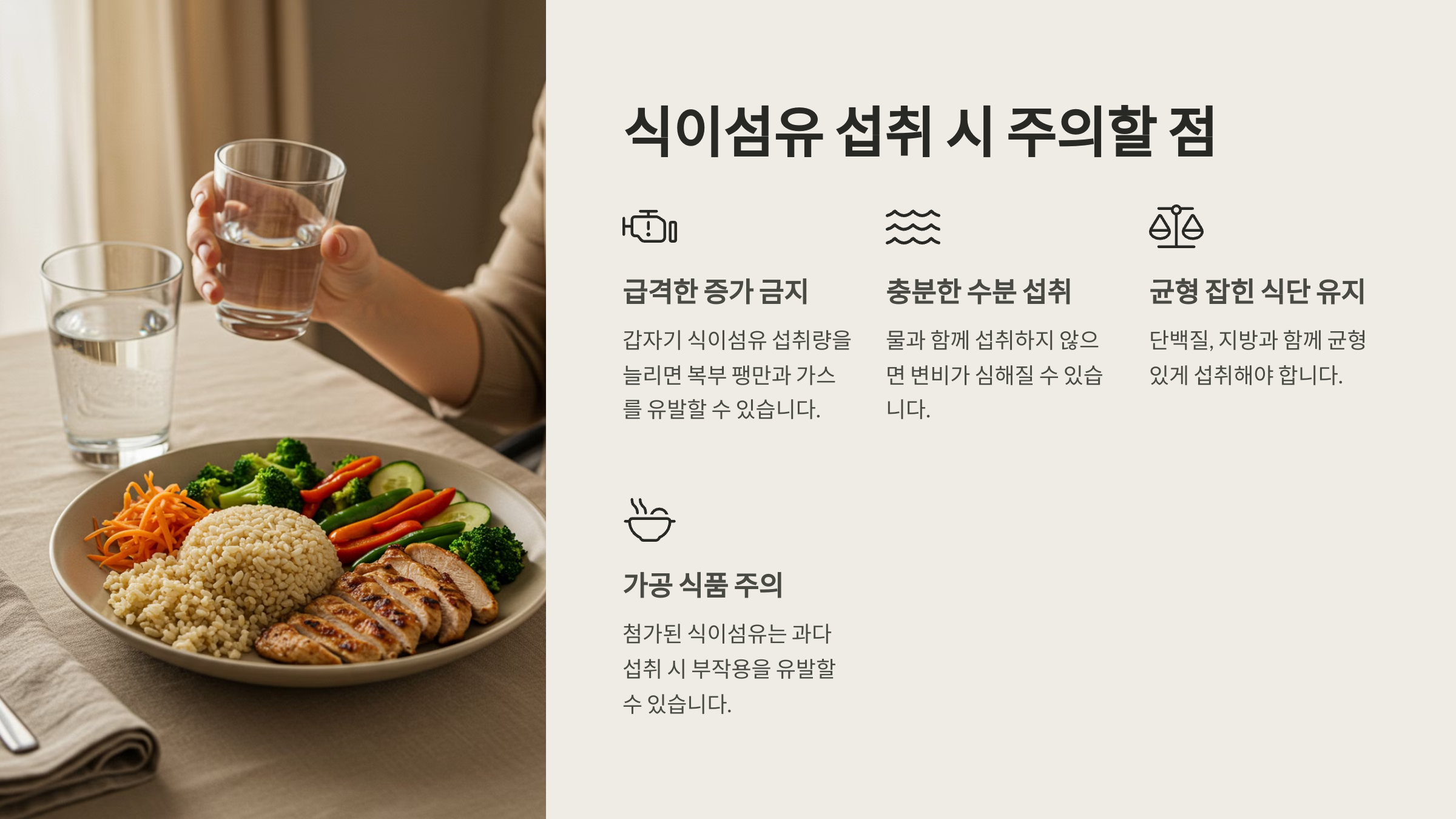 식이섬유가 건강에 유익하지만 올바른 섭취 방법을 지키지 않으면 불편함을 초래할 수 있습니다. 아래 주의 사항을 참고하세요.