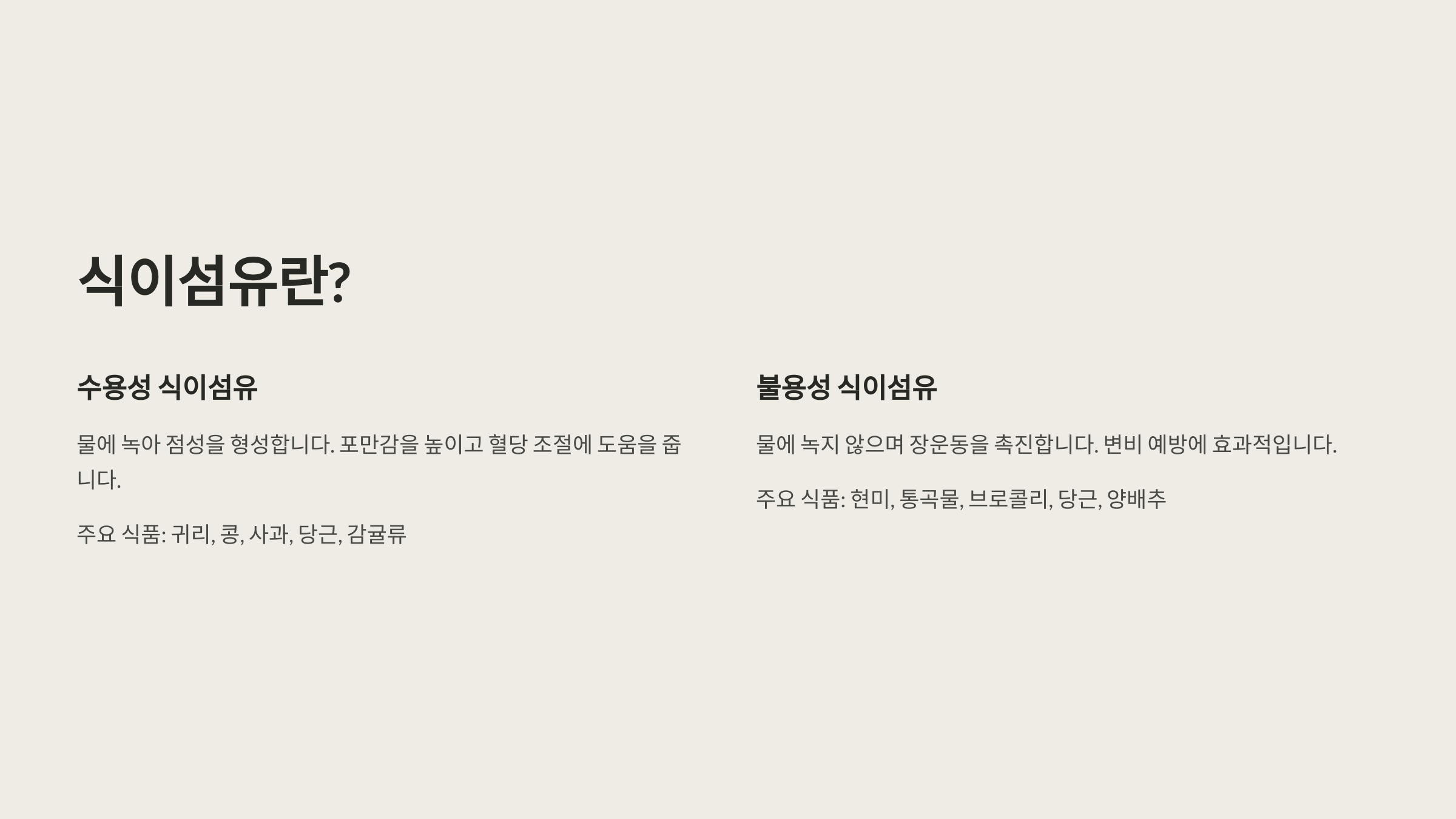| 수용성 식이섬유 | 물에 녹아 점성을 형성하며, 포만감을 높이고 혈당 조절에 도움 | 귀리, 콩, 사과, 당근, 감귤류 |