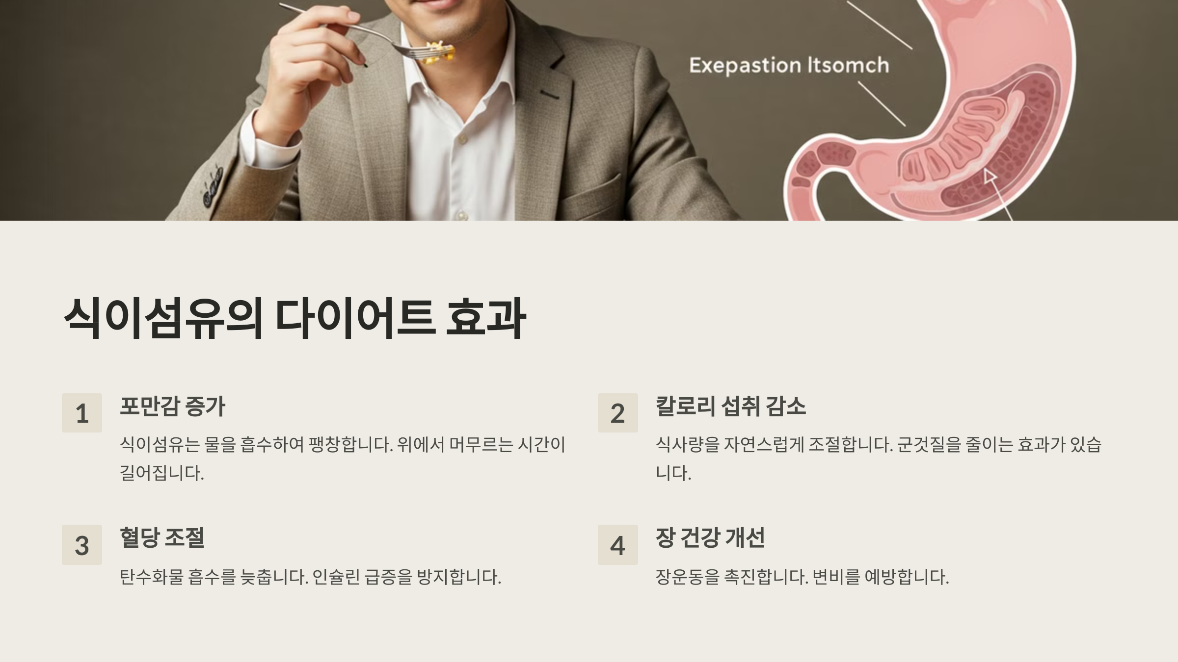 | 포만감 증가 | 식이섬유는 물을 흡수하여 팽창하고 위에서 머무르는 시간이 길어짐 |