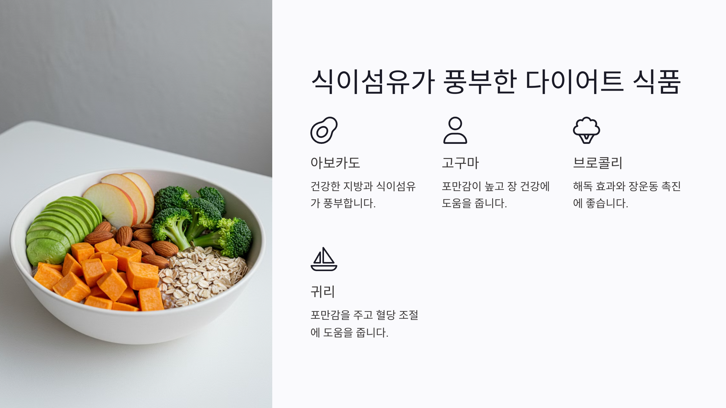 👉 고구마, 사과, 귀리, 아보카도 등이 좋아요!