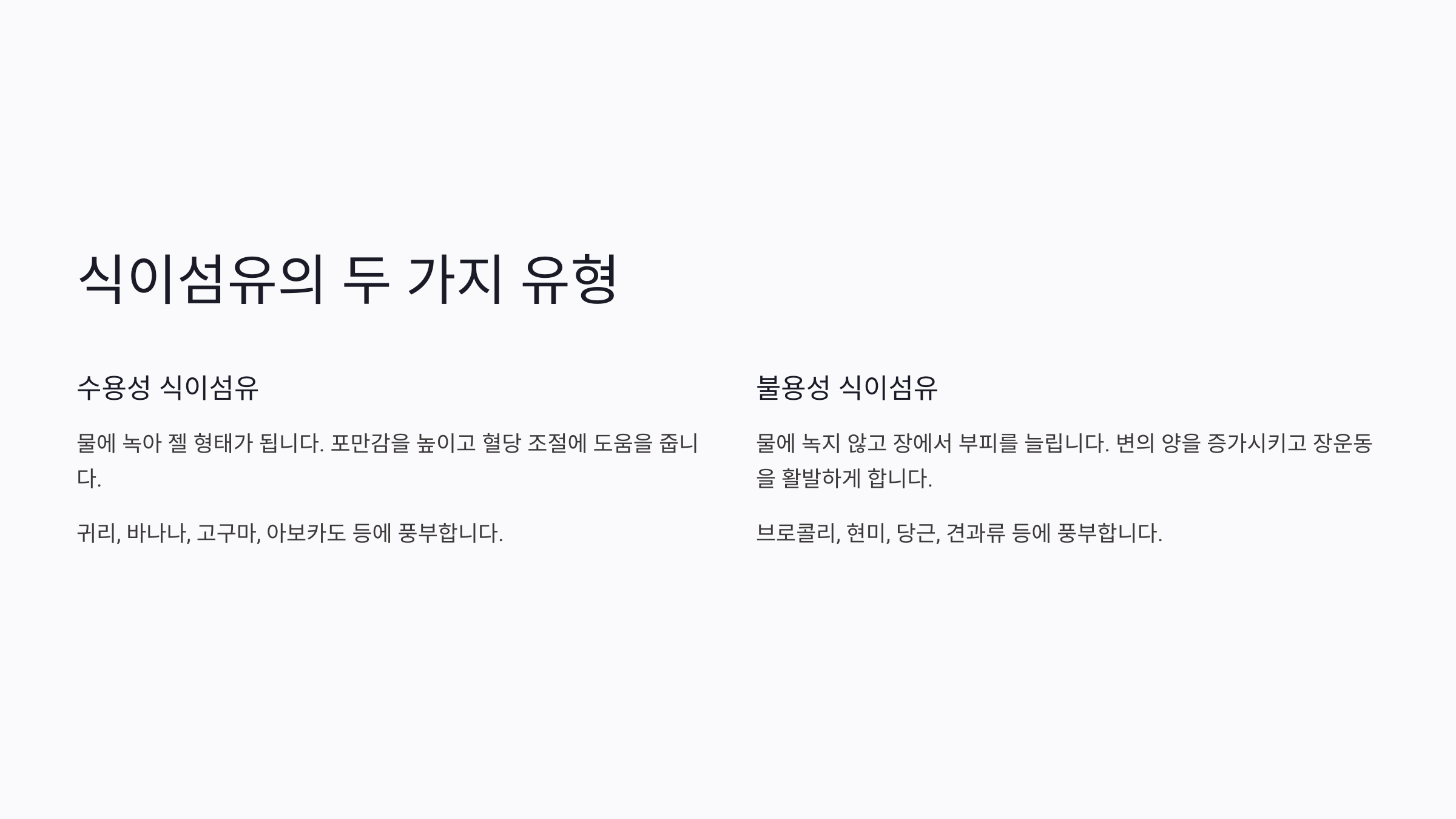 식이섬유는 소화되지 않는 탄수화물로, 장 건강을 돕고 배변 활동을 원활하게 해 줘요. 크게 두 가지 유형이 있어요.