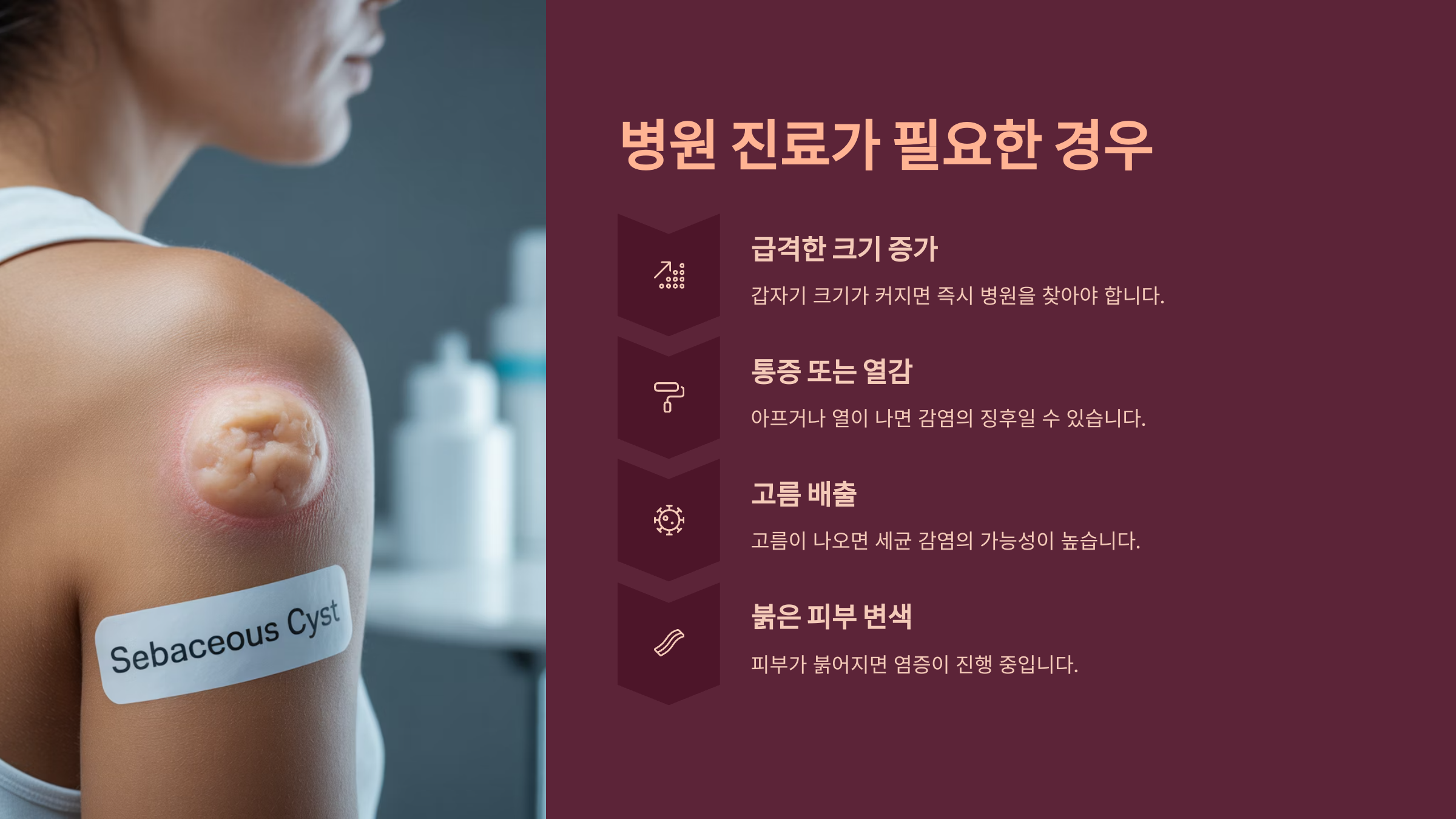 다음과 같은 증상이 나타날 경우 자가치료를 시도하지 말고 즉시 병원을 찾아야 합니다: 급격한 크기 증가, 통증 또는 열감, 고름 배출, 붉은 피부 변색, 발열 등입니다. 이는 감염이나 피지낭종이 아닌 다른 피부 질환(피부암 등)의 가능성을 시사하기 때문입니다. 실제로 한 48세 남성은 단순 낭종이라 생각해 방치하다가 세균 감염으로 인해 수술적 절제를 받은 사례가 있습니다. 자가치료의 전제 조건은 ‘경미한 초기 낭종’이라는 점을 꼭 기억해야 합니다.