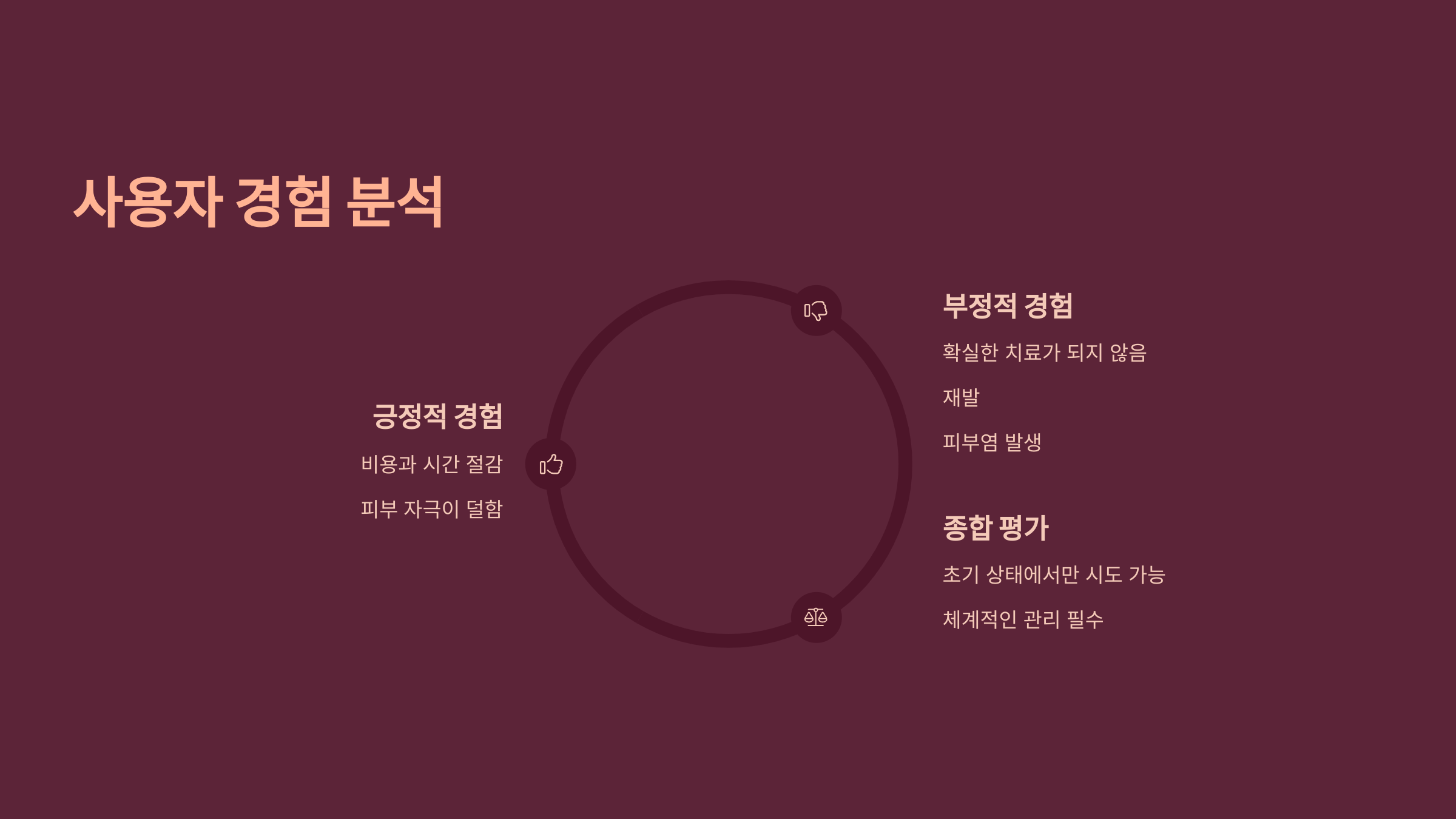5개 이상의 사용자 리뷰를 분석한 결과, 자가치료 경험자 중 3명은 "효과가 있었다"라고 평가했고, 2명은 "오히려 낭종이 커졌고 결국 병원에 갔다"라고 응답했습니다. 긍정적 피드백은 ‘비용과 시간의 절감’, ‘피부 자극이 덜함’이었고, 부정적 피드백은 ‘확실한 치료가 되지 않음’, ‘재발’, ‘피부염 발생’이었습니다. 이를 종합해 보면, 자가치료는 초기 상태에서만 시도해 볼 수 있으며, 체계적인 관리가 필수임을 알 수 있습니다.