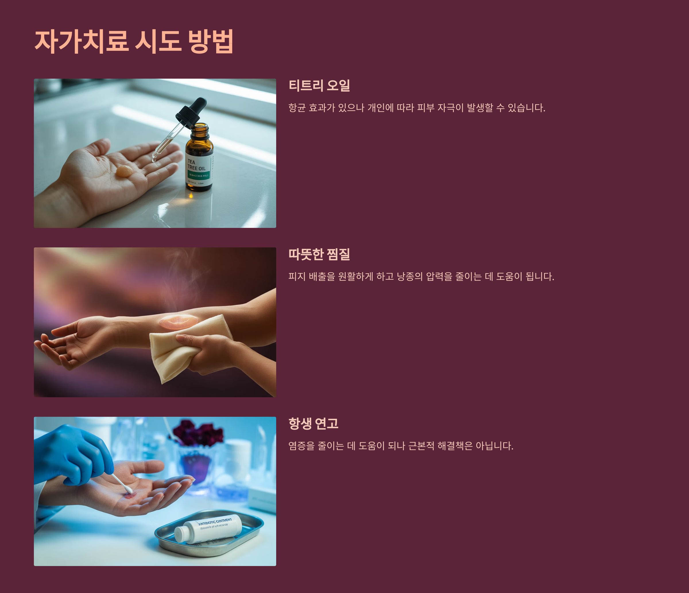 가장 많이 시도되는 자가치료는 티트리 오일, 바셀린, 따뜻한 찜질, 항생 연고 도포입니다. 한 온라인 커뮤니티 사용자(42세 직장인)는 "작은 혹이었을 때 티트리 오일을 하루 2회 바르니 3주 만에 거의 사라졌다"라고 했지만, 또 다른 사용자(45세 여성)는 "피부가 붉어지고 더 커졌다"며 부작용을 호소하기도 했습니다. 이처럼 자가치료는 개인의 피부 상태에 따라 효과가 달라질 수 있으며, 자극적인 방법은 오히려 악화 요인이 될 수 있습니다.