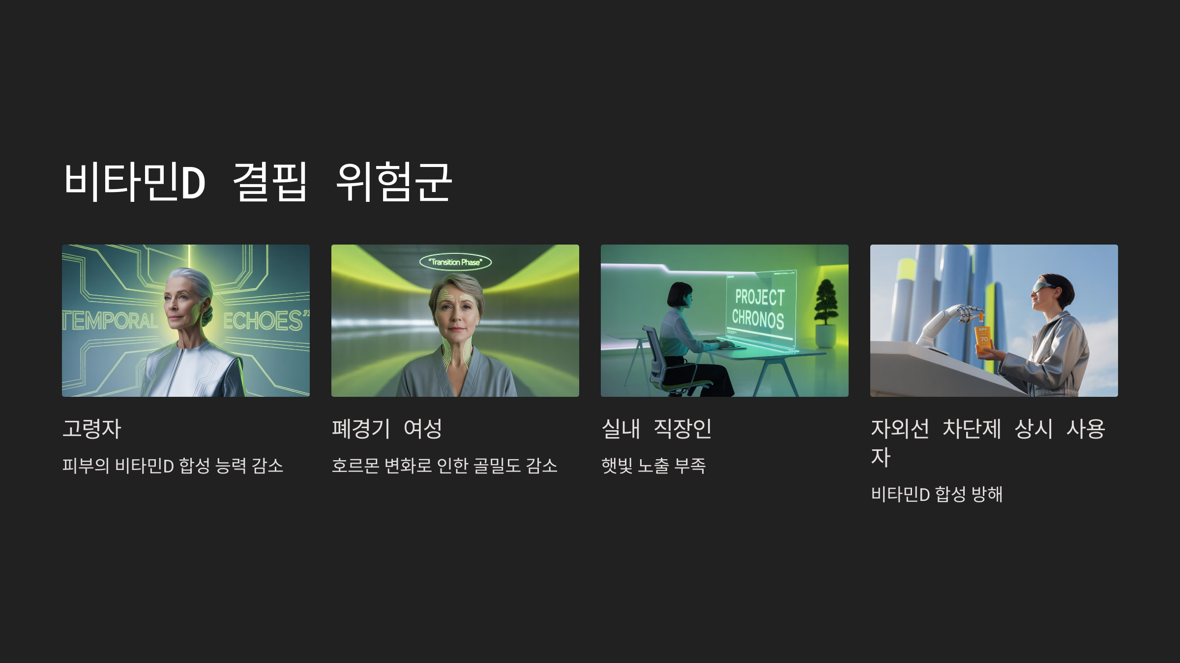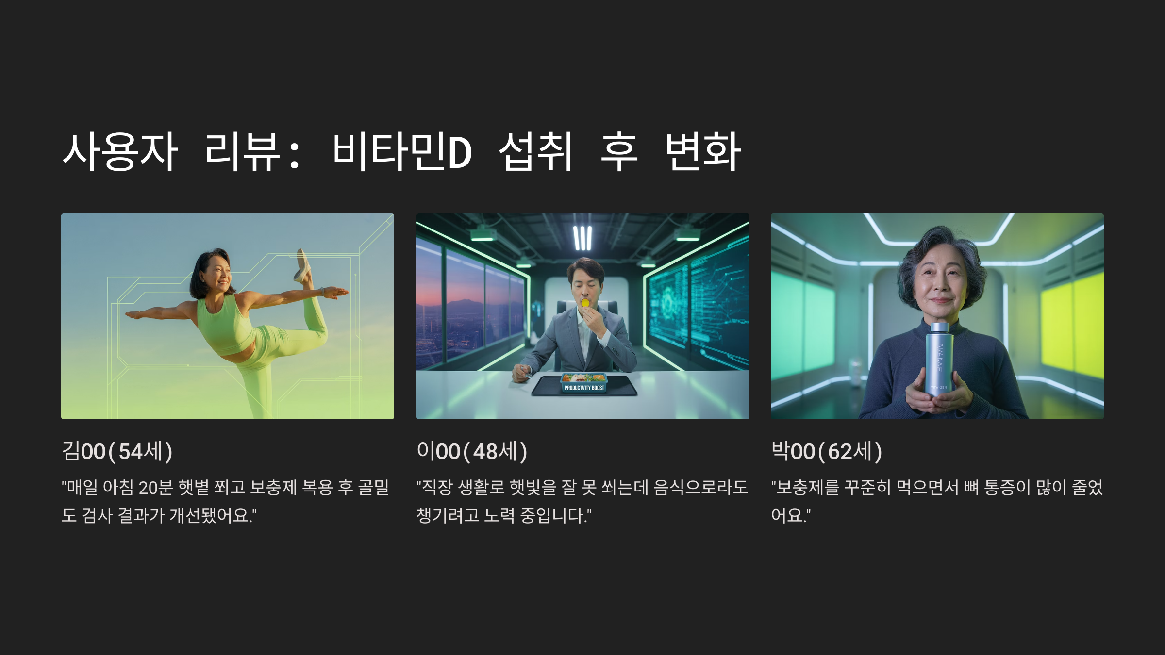 - 오 OO(57세): “햇빛 쬐는 게 쉽지 않지만, 식단과 보충제 병행으로 효과를 보고 있습니다.”