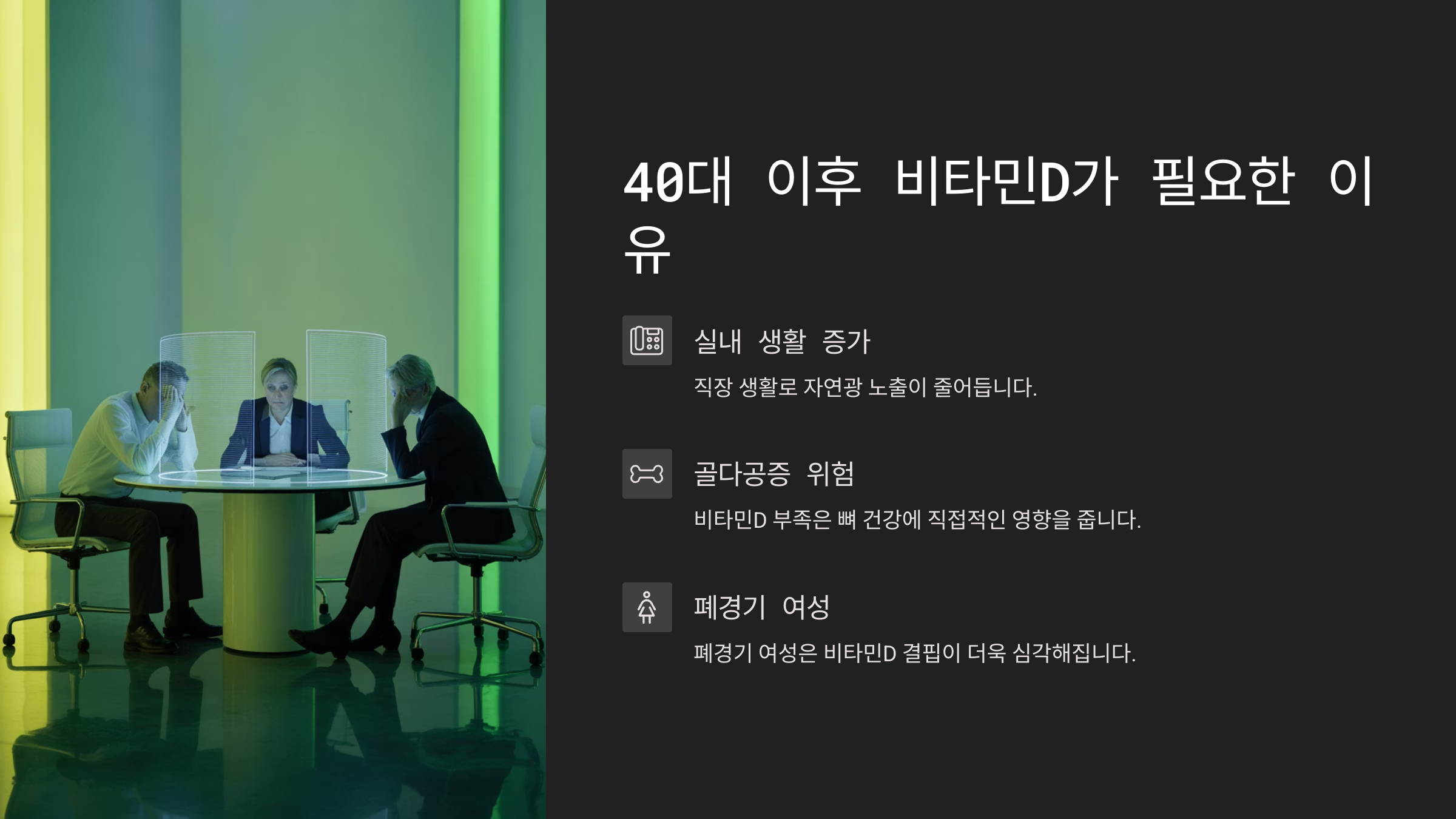 40대 이상 직장인들은 직장 생활과 실내 활동이 많아지면서 자연광 노출이 줄어드는 경우가 많습니다. 비타민D는 칼슘 흡수를 돕는 필수 영양소로, 부족할 경우 뼈가 약해지고 골다공증 위험이 커집니다. 특히 폐경기 여성은 비타민D 결핍이 더욱 심각해지기 때문에 꾸준한 관리가 필요합니다.