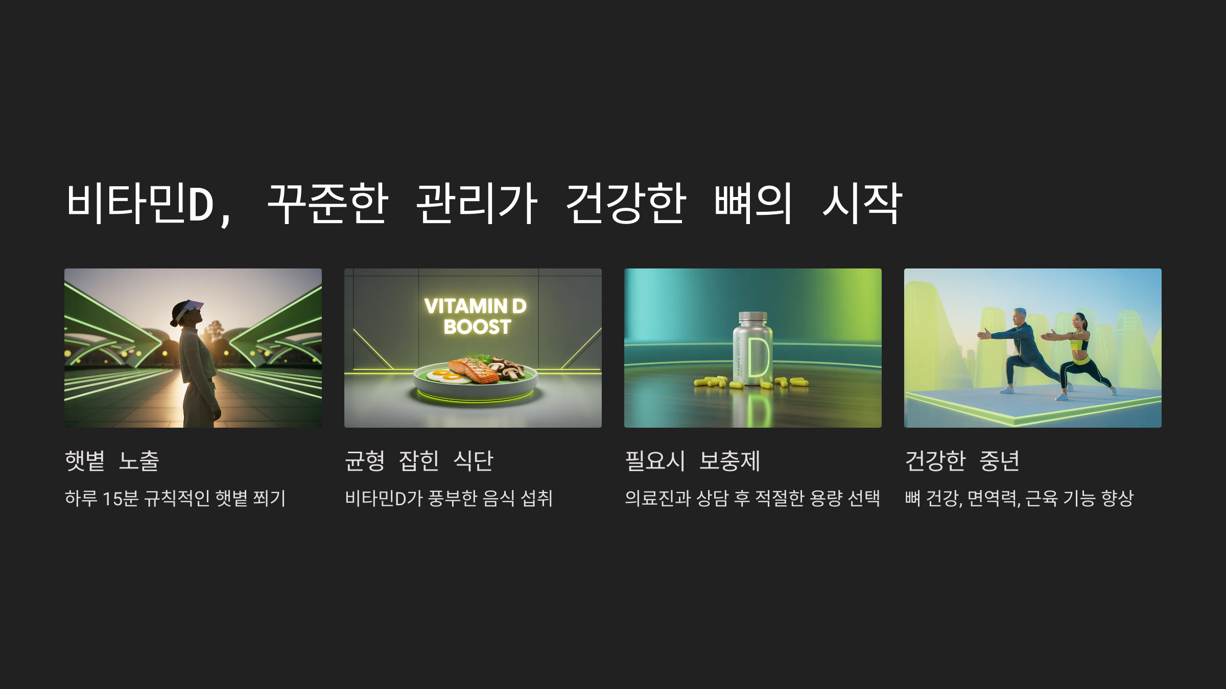 - 김 OO(54세): “매일 아침 20분 햇볕 쬐고 비타민D 보충제 복용 후 골밀도 검사 결과가 개선됐어요.”