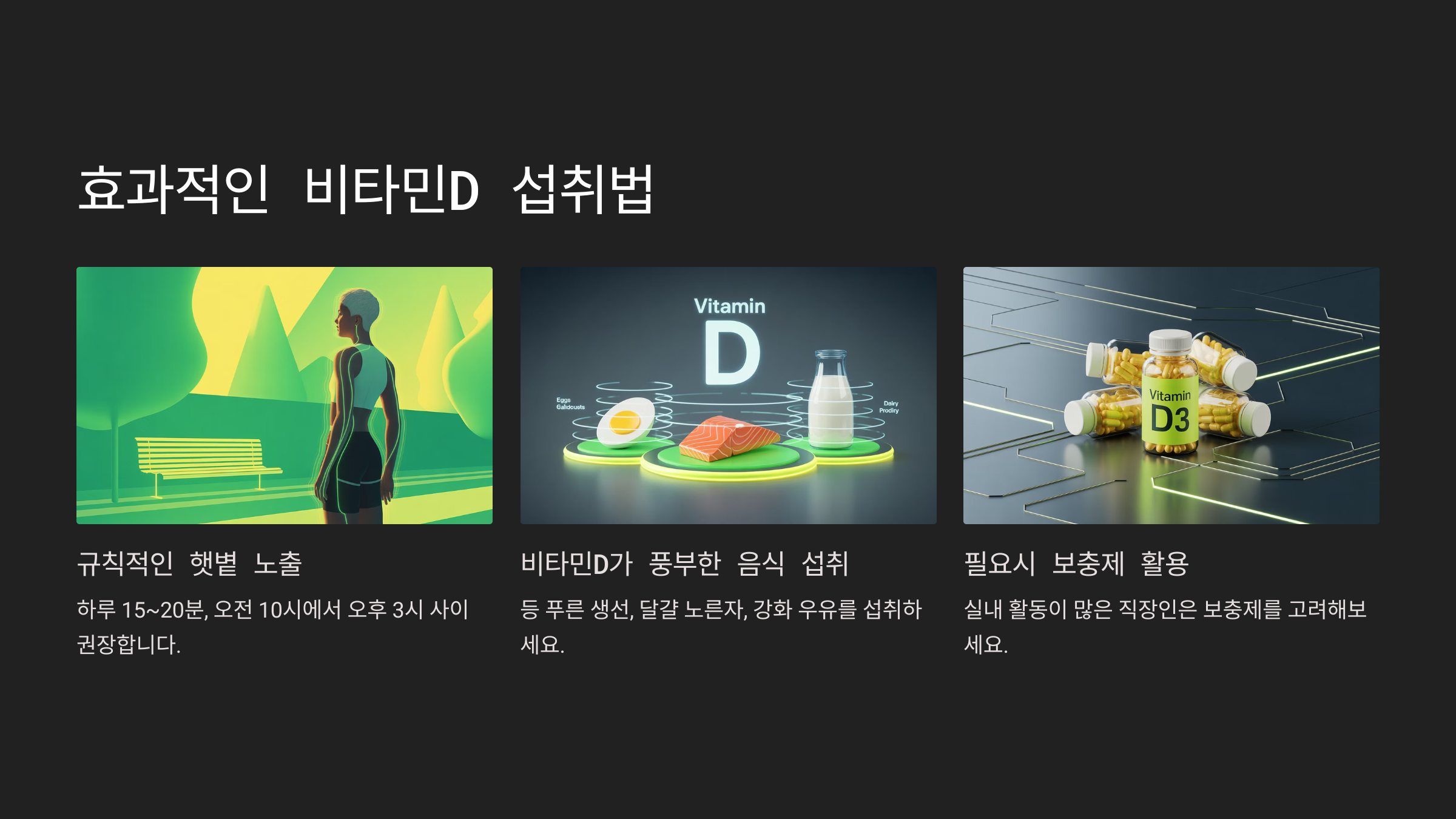 비타민D는 피부에서 햇빛을 받으면 자연 생성됩니다. 하루 15~20분, 오전 10시에서 오후 3시 사이에 얼굴과 팔 노출을 권장합니다. 지나친 자외선 차단은 비타민D 합성을 방해할 수 있으니 주의하세요.