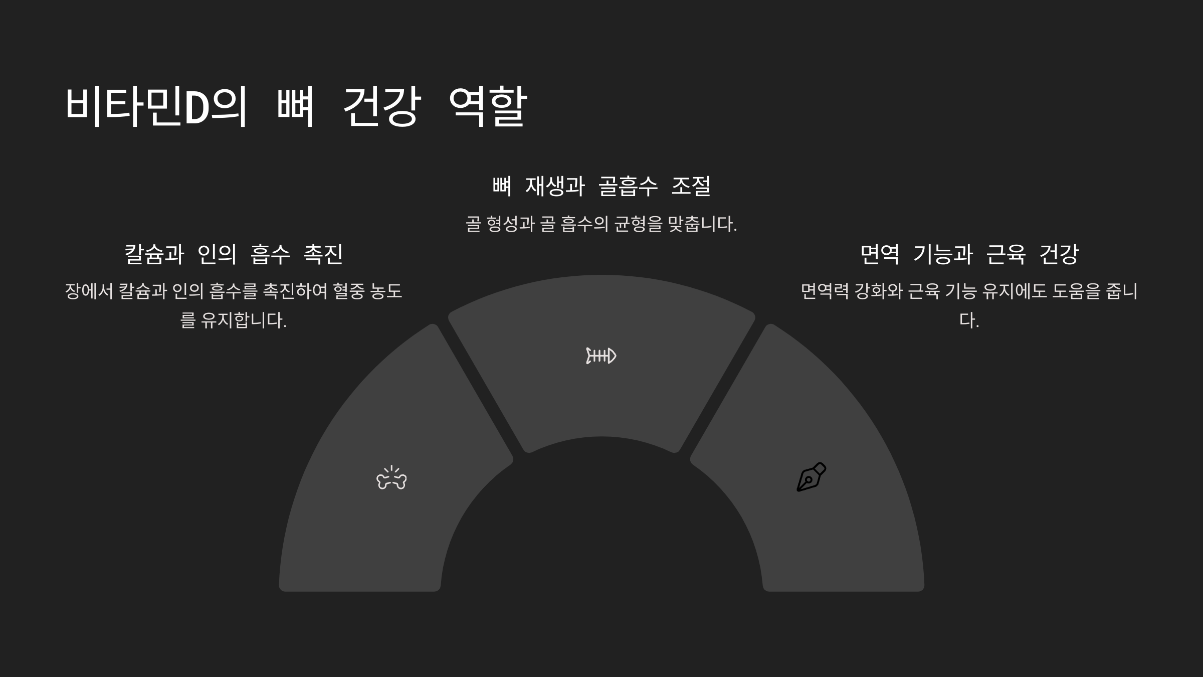 비타민D는 뼈세포의 활동을 조절하여, 골 형성과 골 흡수의 균형을 맞춥니다. 부족하면 뼈가 약해지고 쉽게 부러질 위험이 높아집니다.