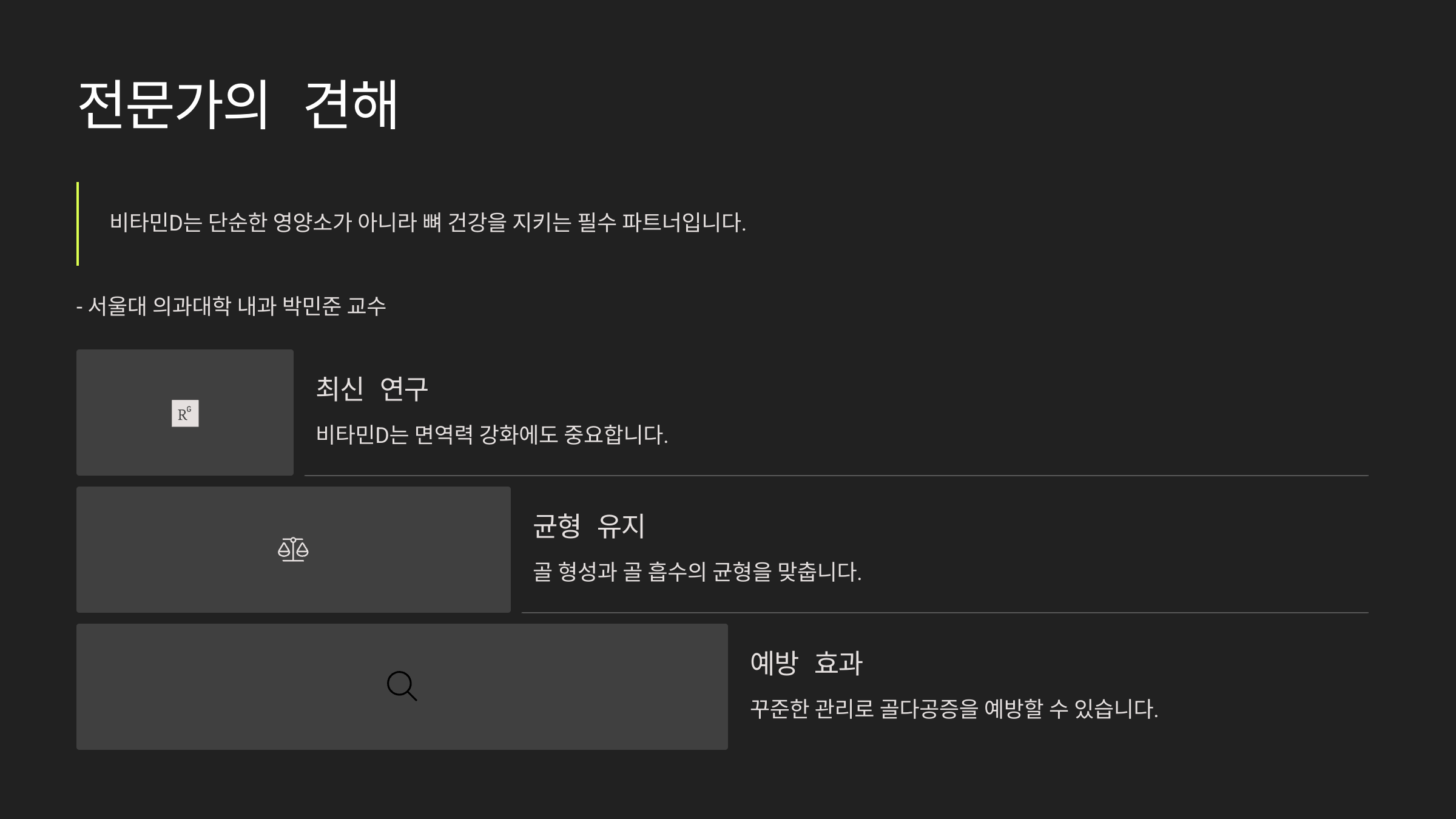 “비타민D는 단순한 영양소가 아니라 뼈 건강을 지키는 필수 파트너입니다.” – 서울대 의과대학 내과 박민준 교수