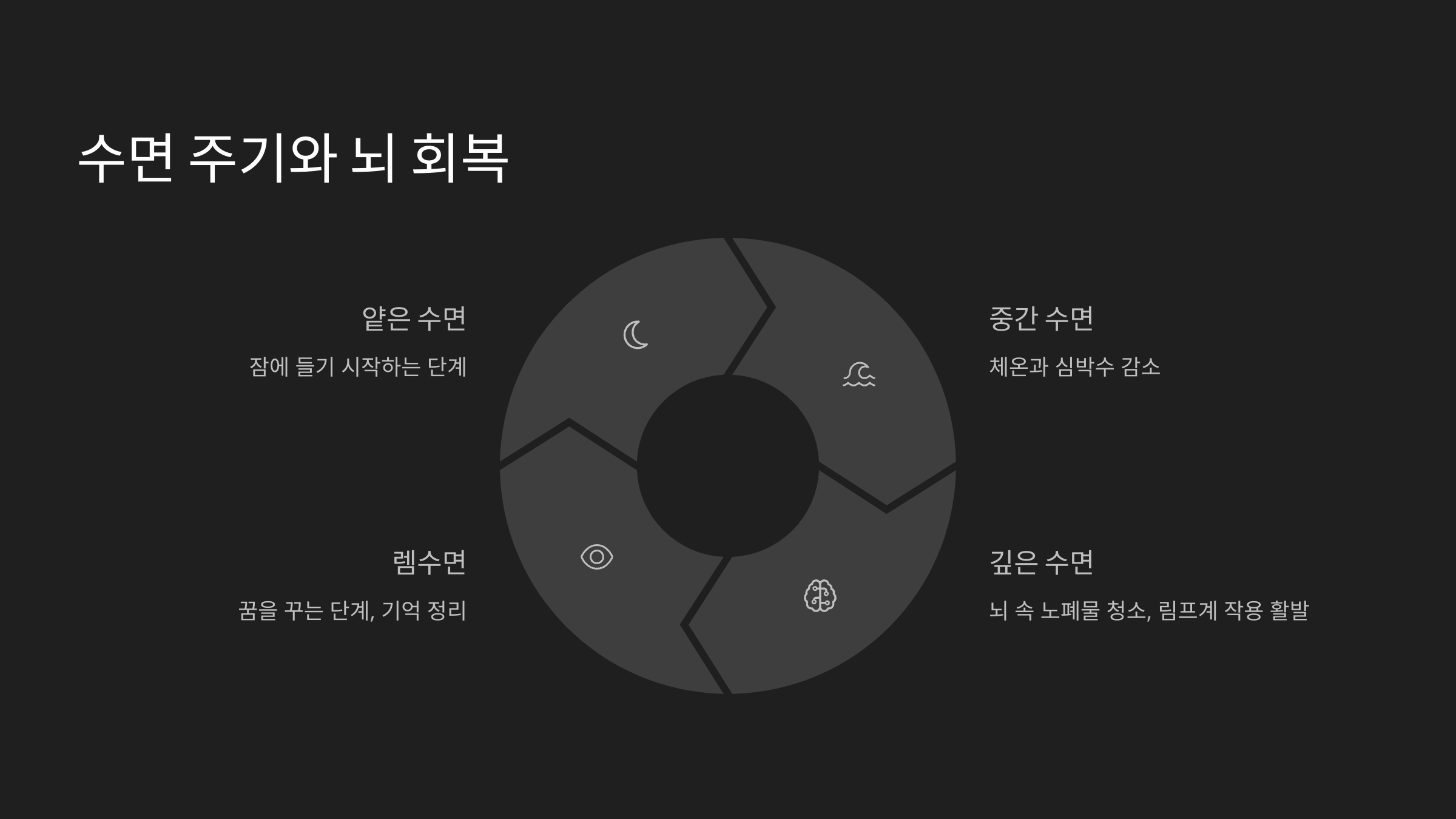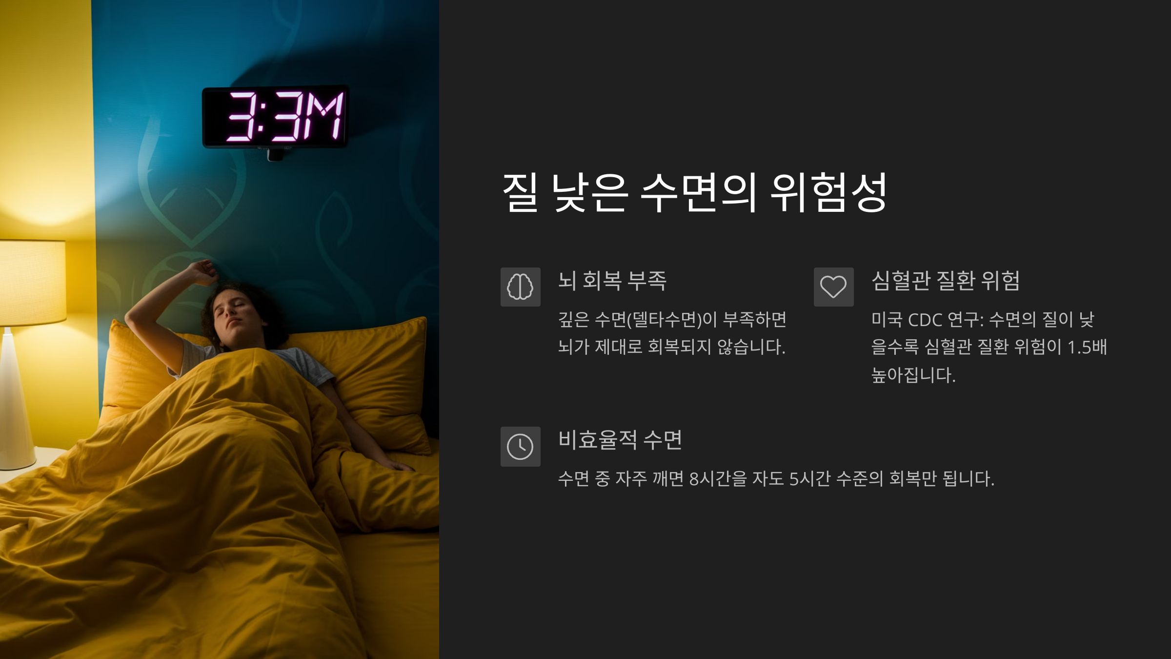 깊은 수면은 뇌 속의 노폐물을 청소하는 림프계 작용이 활발히 이뤄지는 시간입니다. 이를 통해 기억력, 집중력, 감정 안정이 가능해집니다. 하지만 수면 도중 자주 깨는 패턴은 이 깊은 수면 사이클을 끊어버립니다. 결과적으로 8시간을 자도 5시간 수준의 회복만 되는 것이죠.