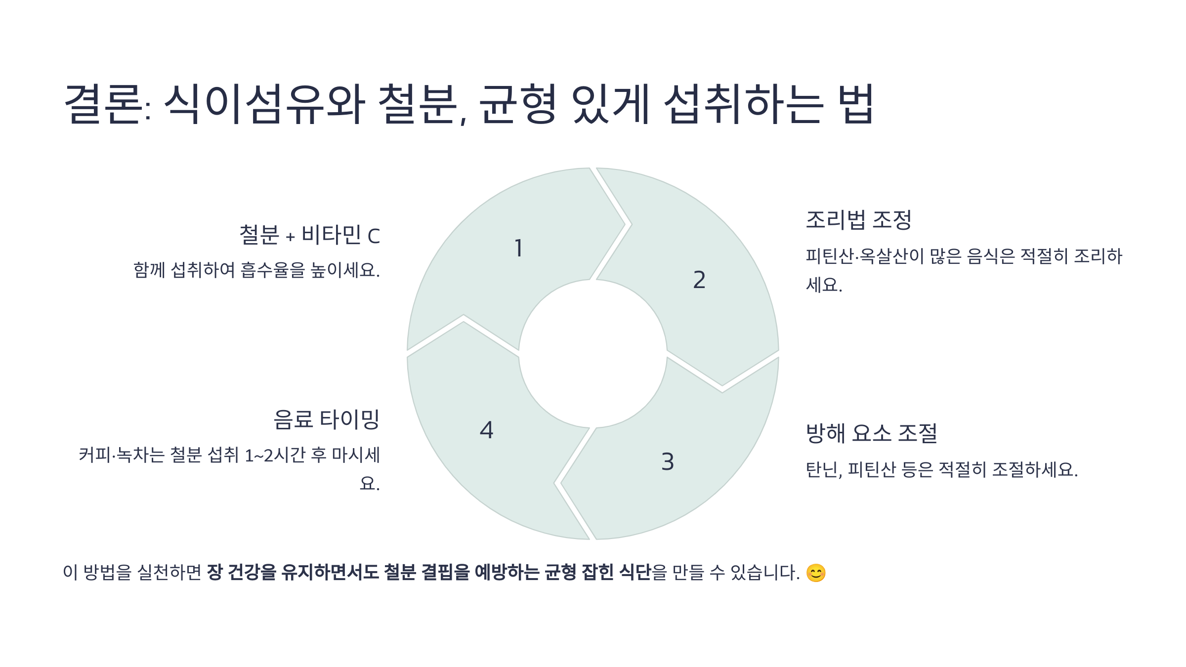 ✅ 식이섬유도 중요하지만, 철분 흡수를 방해하는 요소(탄닌, 피틴산 등)는 조절
