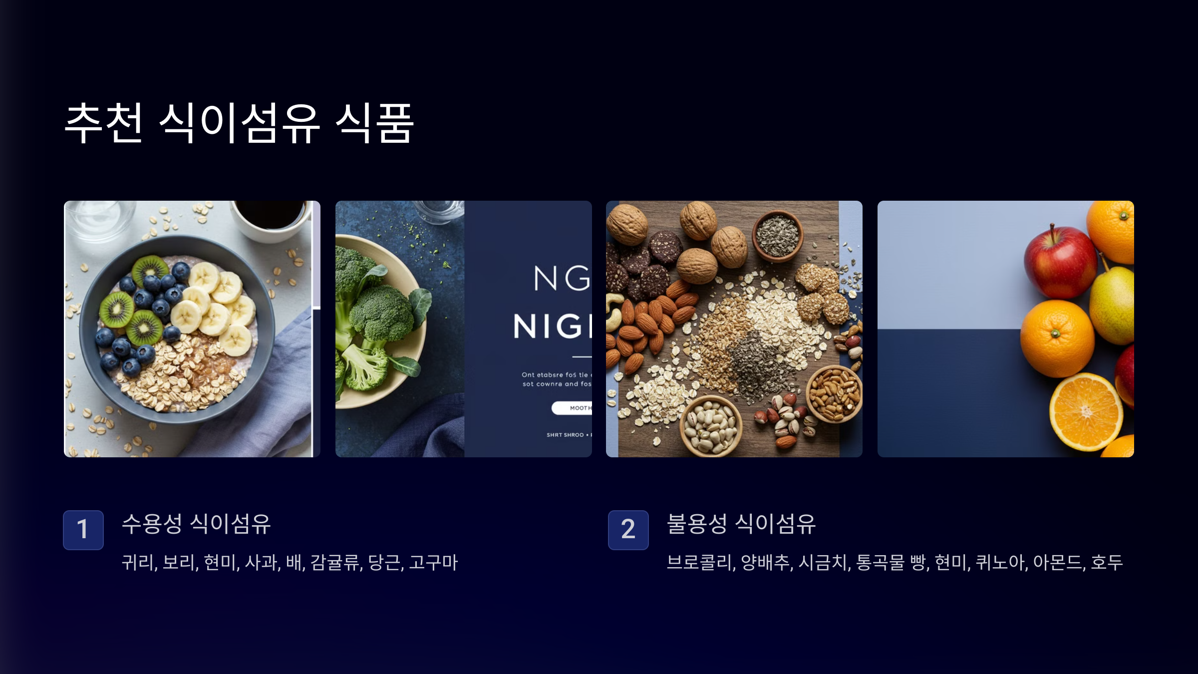 - 수용성 식이섬유: 물에 녹아 젤처럼 변하며, 혈당 조절과 장 내 미생물 균형을 돕습니다. (예: 귀리, 사과, 당근)