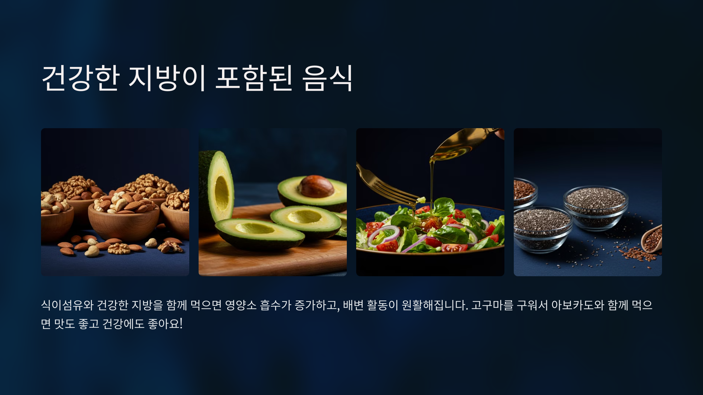 식이섬유와 건강한 지방을 함께 먹으면 영양소 흡수가 증가하고, 배변 활동이 원활해집니다.