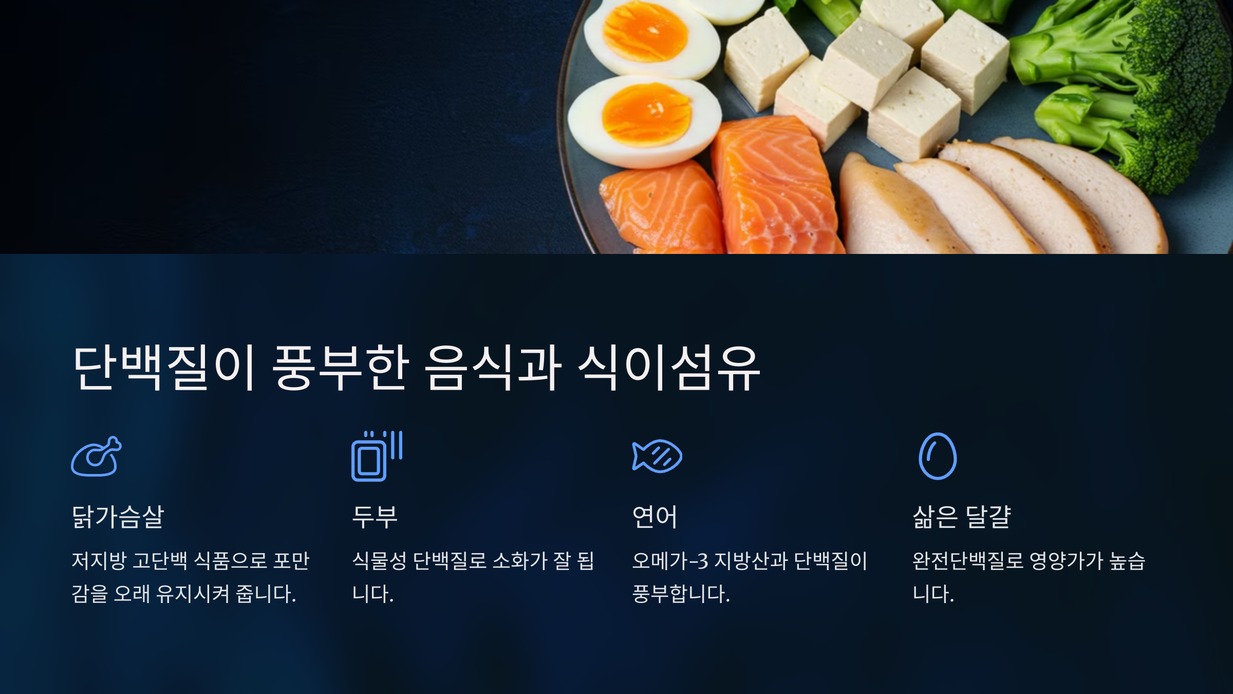 식이섬유는 단백질과 함께 섭취하면 소화 속도를 조절하여 포만감을 오래 유지하는 데 도움을 줍니다. 또한 혈당 상승을 억제하는 효과도 있죠.