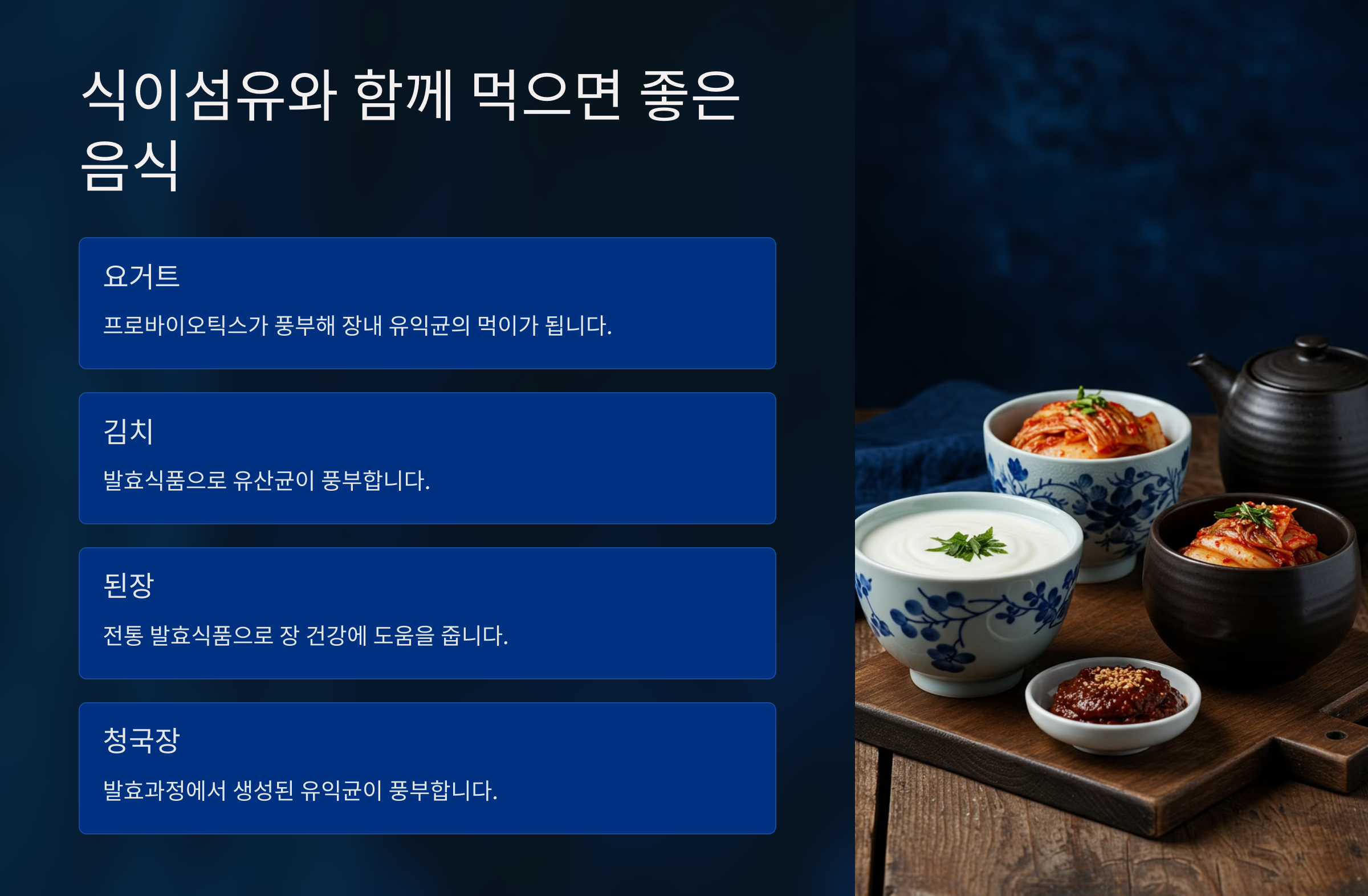 식이섬유는 장내 유익균(프로바이오틱스)의 먹이가 되어 장 건강을 증진시킵니다. 따라서 유산균이 풍부한 음식과 함께 섭취하면 최상의 효과를 볼 수 있어요.