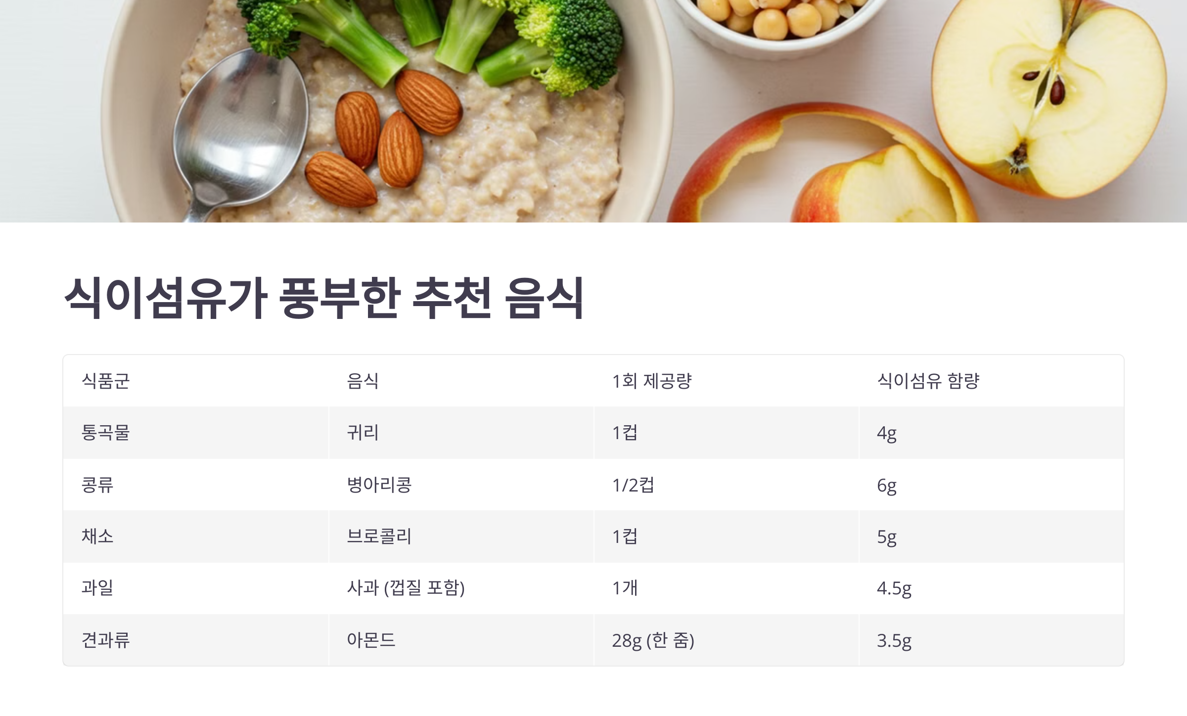 ⚠️ 식이섬유를 갑자기 많이 섭취하면 복부 팽만, 가스가 발생할 수 있습니다.