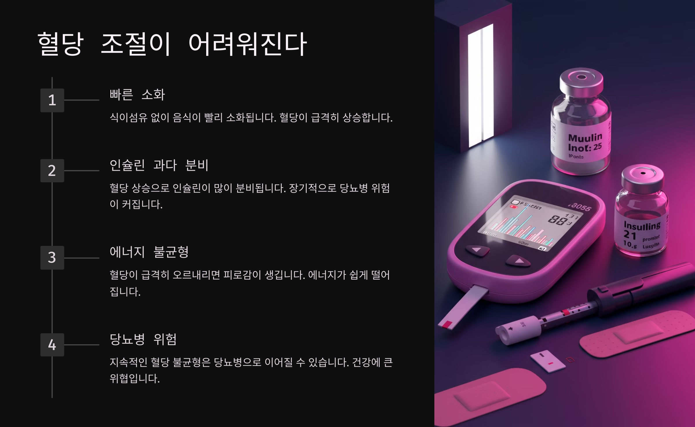 (1) 혈당이 급격히 올라가면 인슐린 분비가 증가하고, 이는 당뇨병으로 이어질 수 있습니다.