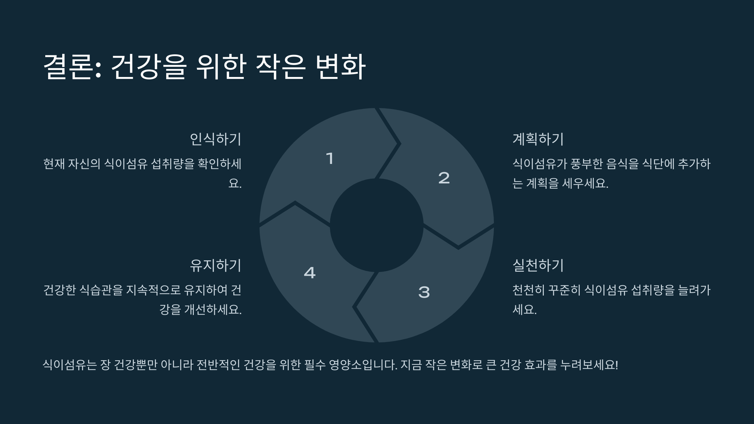 식이섬유는 장 건강뿐만 아니라 전반적인 건강을 위한 필수 영양소입니다. 하루 권장량을 충족하는 식이섬유 섭취를 통해 체중 관리, 혈당 조절, 심혈관 건강 보호 등 여러 이점을 누릴 수 있습니다. 오늘 하루만이라도 식이섬유 섭취를 점검하고, 부족하다면 이를 채워보세요! 지금이 마지막 기회로, 여러분의 건강을 위한 작은 변화를 시작해 보세요.